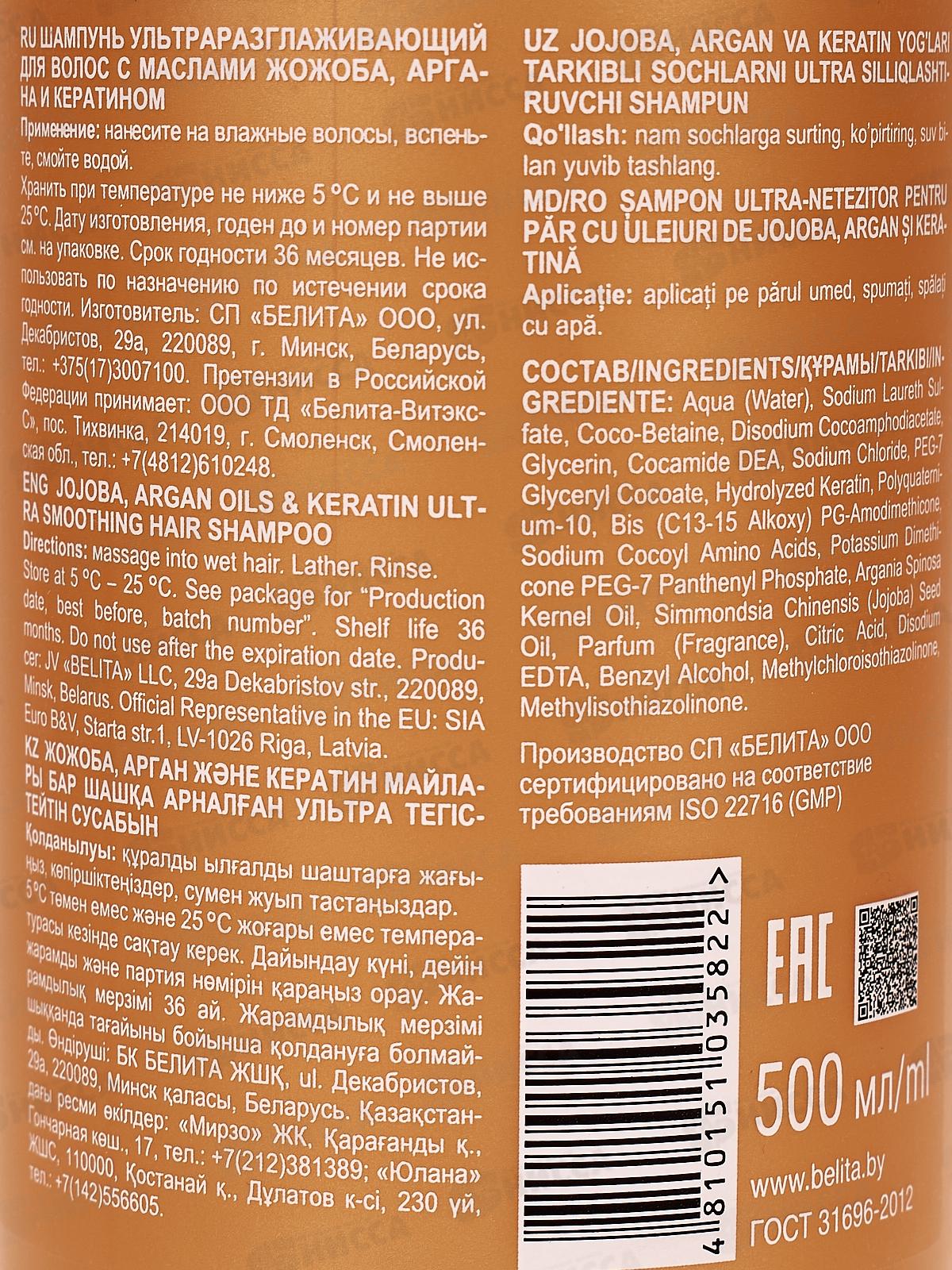 Масла арганы и жожоба интенсивно питают и укрепляют волосы, способствуют сохранению влаги глубоко в структуре волос, восстанавливают их плотность и эластичность. Состав: Аква (вода), Лауретсульфат натрия, Коко-бетаин, Динатриевый кокоамфодиацетат, Глицерин, Кокамид DEA, хлорид натрия, ПЭГ-7 Глицерилкоат, гидролизованный кератин, Поликватерниум-10, Бис(C13-15 Алкокси) PG-амодиметикон, Кокоил-аминокислоты натрия, Диметикон калия, ПЭГ-7 пантенилфосфат., Масло косточек аргании спинозы, Масло семян симмондсии китайской (жожоба), Парфюмированная вода, Лимонная кислота, Динатриевый ЭДТА, Бензиловый спирт, метилхлоризотиазолинон, Метилизотиазолинон.