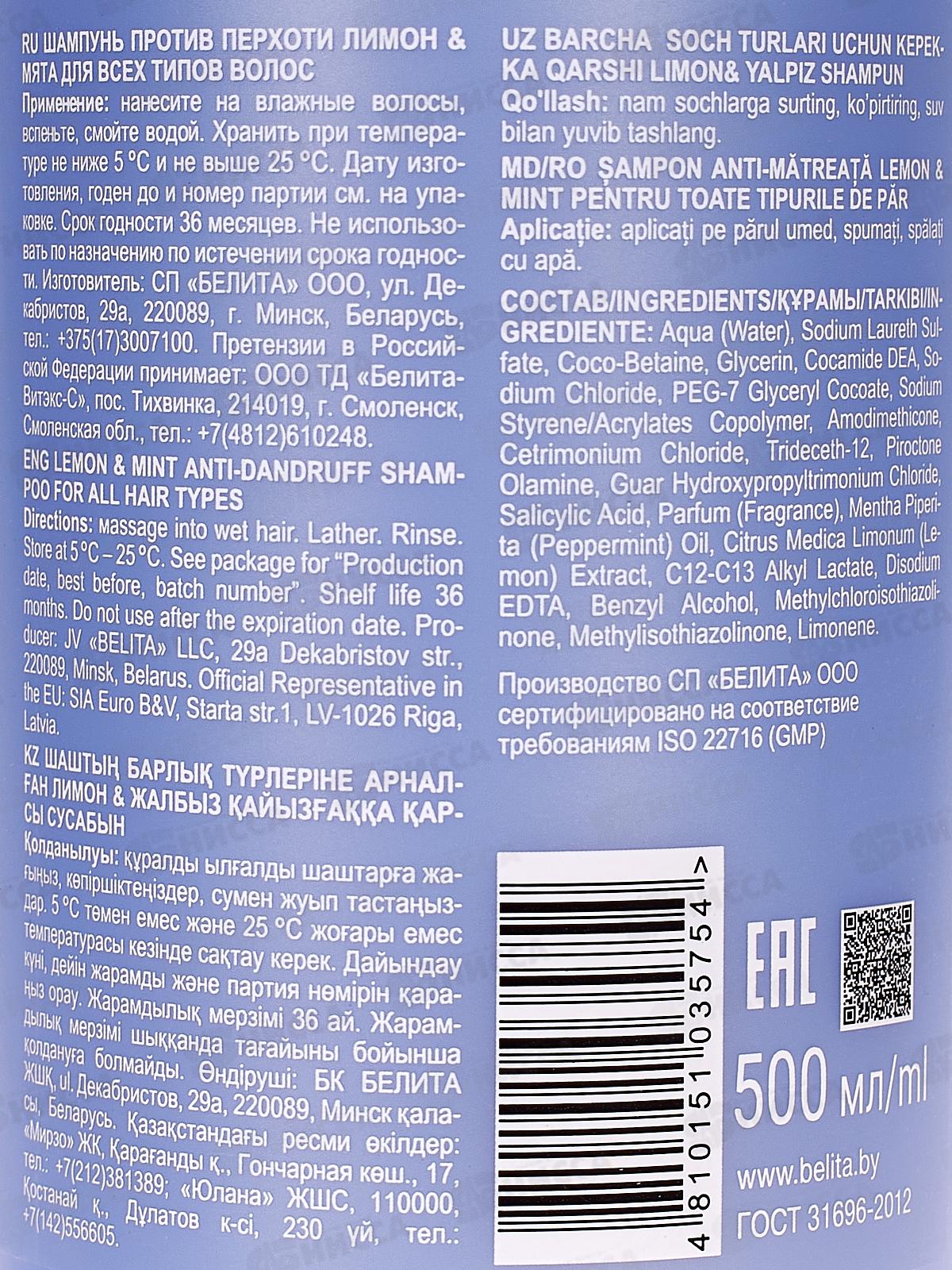 Шампунь для всех типов волос станет вашим помощником в устранении перхоти. С шампунем Лимон&Мята для всех типов волос ваши волосы не только избавятся от перхоти, но также обретут естественный блеск и невероятную свежесть. Состав: Аква (вода), Лауретсульфат натрия, Коко-бетаин, Глицерин, Кокамид ДЭА, хлорид натрия, Глицерилкокоат ПЭГ-7, Сополимер стирола и акрилатов натрия, Амодиметикон, Цетримоний хлорид, Тридецет-12, Пироктон Оламин, гидроксипропилтримоний хлорид гуара, салициловая кислота, Парфюмированная вода, Мята перечная (Масло мяты перечной, экстракт лимона, алкиллактат С12-С13, Динатриевый ЭДТА, бензиловый спирт, метилхлоризотиазолинон, Methylisothiazolinone, Лимонен.