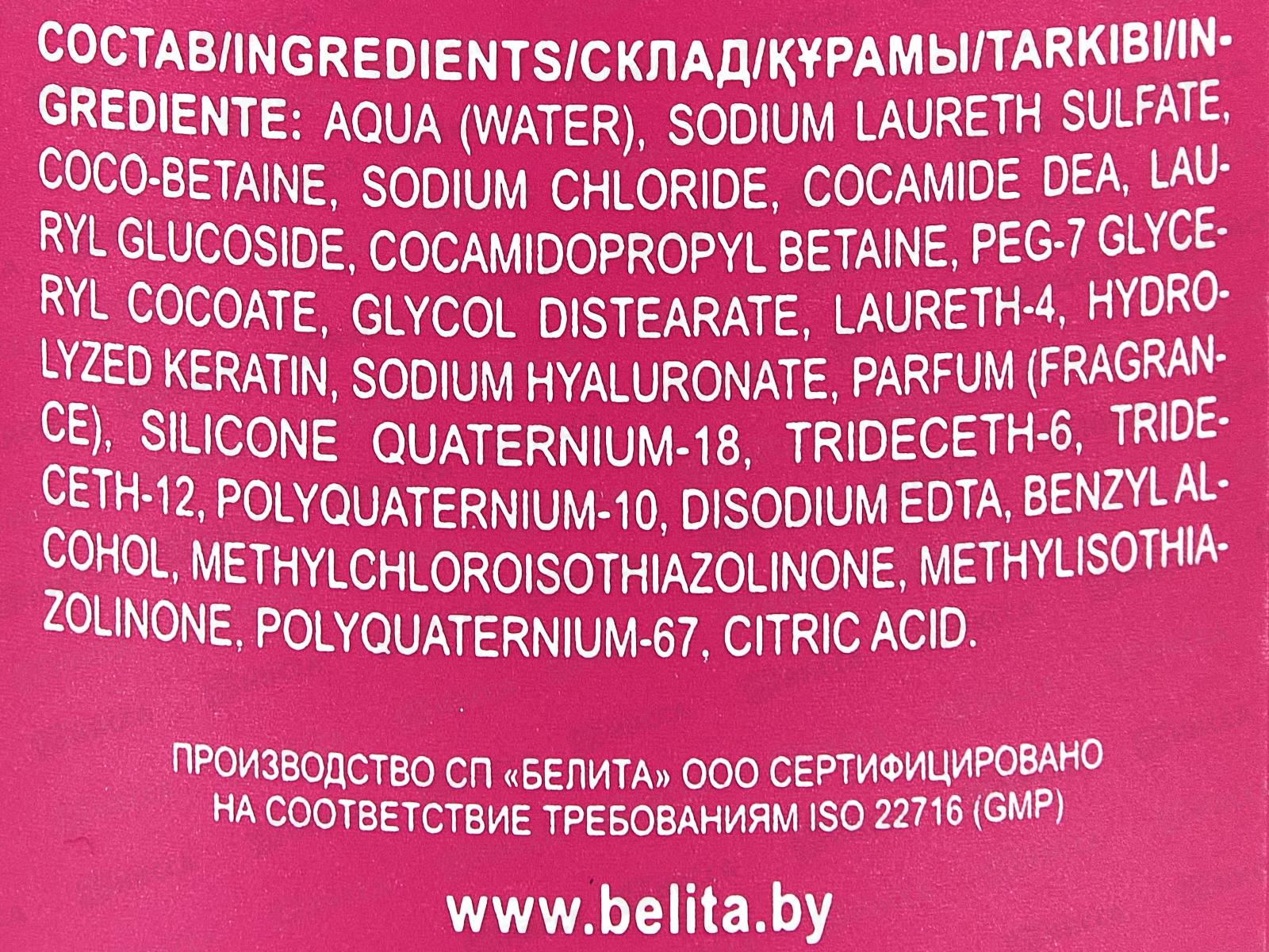 Шампунь разработан для волос, потерявших свою внутреннюю структуру, слабых и подверженных ломкости. Состав: вода, лауретсульфат натрия, кокобетаин, хлорид натрия, кокамид ДЭА, лаурилглюкозид, кокамидопропилбетаин, ПЭГ-7 глицерилкокоат, гликольдистеарат, лаурет-4, кокамидопропилбетаин, гидролизованный кератин, парфюмерная композиция, силикон кватерниум-18, тридецет-6, тридецет-12, поликватерниум-10, ЭДТА динатрия, бензиловый спирт, метилхлоризотиазолинон, метилизотиазолинон, поликватерниум-67, кислота лимонная, гиалуронат натрия.