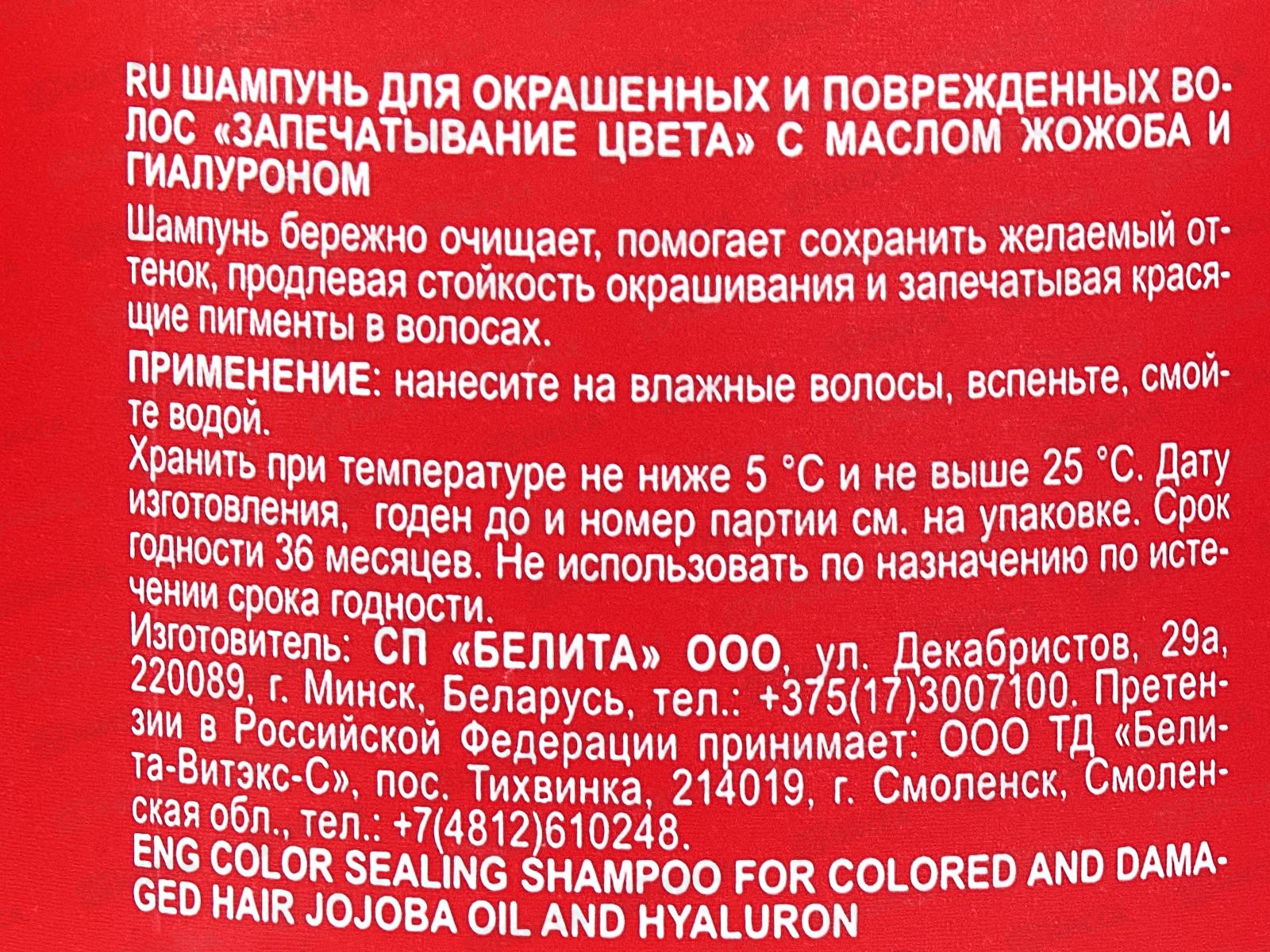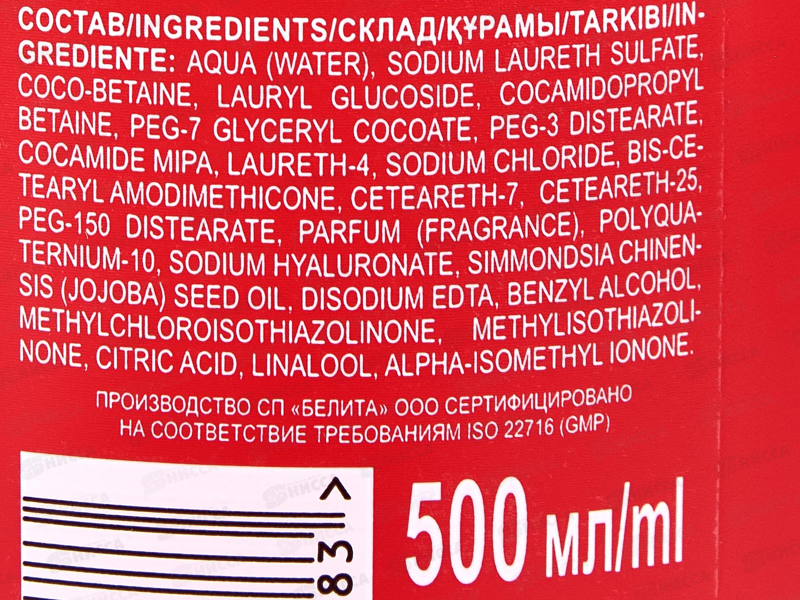 Шампунь бережно очищает, питает и восстанавливает волосы после окрашивания, помогает сохранить желаемый оттенок, продлевая стойкость окрашивания и запечатывая красящие пигменты внутри волос. Специальная комбинация кондиционеров сохраняет цвет, укрепляет ослабленные кератиновые связи и восстанавливает структуру окрашенных волос.Разработан для окрашенных, мелированных, химически обработанных и поврежденных волос. Состав: Аква (вода), Лауретсульфат натрия, Коко-бетаин, Лаурилглюкозид, Кокамидопропилбетаин, ПЭГ-7 Глицерилкокоат, Кокамид MIPA, Лаурет-4, ПЭГ-3 Дистеарат, Бис-Цетеариламодиметикон, Цетеарет-7, Цетеарет-25, ПЭГ-150 Дистеарат, Парфюмированная вода, Хлорид натрия, Поликватерниум-10, Динатрий ЭДТА, Бензиловый спирт, метилхлоризотиазолинон, Метилизотиазолинон, Лимонная кислота, Масло семян симмондсии китайской (жожоба), гиалуронат натрия, Линалоол, Альфа-Изометилионон.