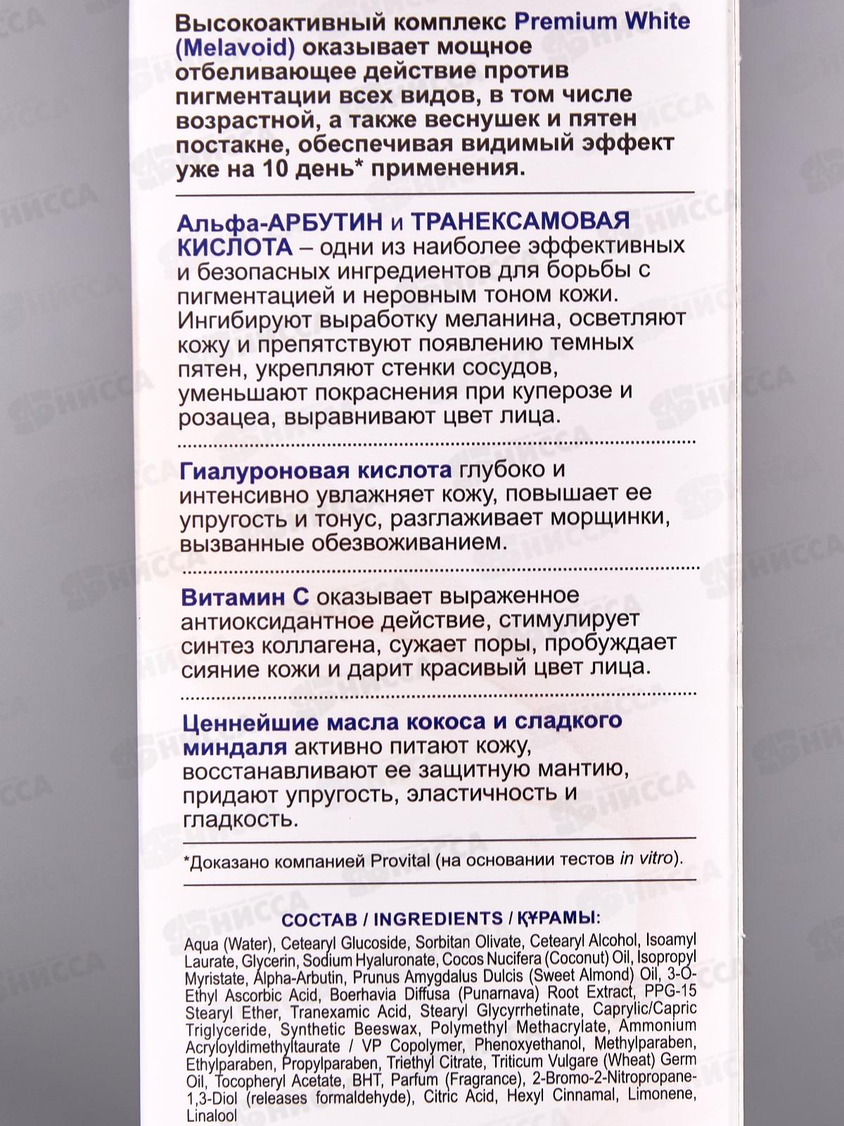 Мощное отбеливающее действие против пигментации различного происхождения, веснушек и пятен постакне Предупреждение пигментации, в том числе появляющейся с возрастом и в послеродовой период. Состав: вода, цетеарилглюкозид, сорбитаноливат, цетеариловый спирт, изоамиллаурат, глицерин, гиалуронат натрия, масло Cocos Nucifera (кокосовое), изопропилмиристат, альфа-арбутин, масло Prunus Amygdalus Dulcis (сладкого миндаля), 3-o-этиласкорбиновая кислота, экстракт корня Boerhavia diffusa (пунарнавы), ППГ-15 стеариловый эфир, транексамовая кислота, глицерилтрикаприлат/капрат, воск пчелиный синтетический, полиметилметакрилат, сополимер акрилоилдиметилтаурата аммония и винилпирролидона, феноксиэтанол, метилпарабен, этилпарабен, пропилпарабен, триэтилцитрат, масло зародышей Triticum vulgare (пшеницы), токоферилацетат, БГТ, парфюмерная композиция, стеарилглицирезинат, 2-бром-2-нитропропан-1,3-диол, лимонная кислота, гексилциннамаль, лимонен, линалол.
