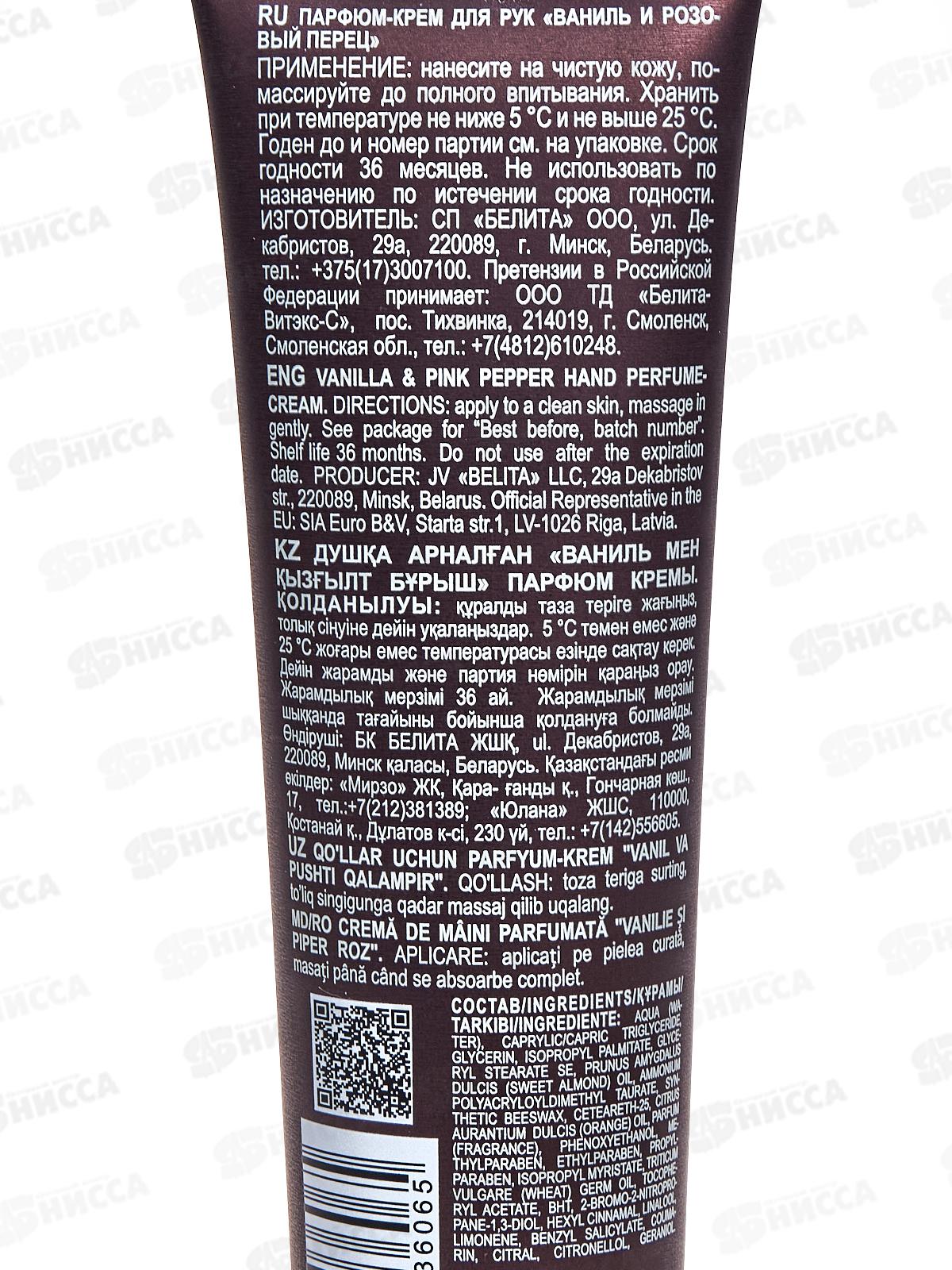 Преобразите кожу рук с парфюм-кремом «Ваниль и розовый перец», обогащенным маслом апельсина и миндаля. Он не только питает и увлажняет кожу, но и окутывает ее нежным и изысканным ароматом. Состав: Aqua (Вода), Каприловый/каприновый триглицерид, Глицерин, изопропилпальмитат, глицерилстеарат SE, Prunus Amygdalus Dulcis (Сладкий миндаль) Масло, полиакрилоилдиметилтаурат аммония, Синтетический пчелиный воск, Цетеарет-25, Цитрусовые Aurantium Dulcis (апельсин) Масло, парфюмированное (отдушка), феноксиэтанол, Метилпарабен, Этилпарабен, Пропилпарабен, изопропилмиристат, Масло зародышей пшеницы Triticum Vulgare, токоферилацетат, BHT, 2-Бром-2-Нитропропан-1,3-диол, Гексилциннамал, Линалоол, Лимонен, бензилсалицилат, Кумарин, Цитраль, Цитронеллол, Гераниол.