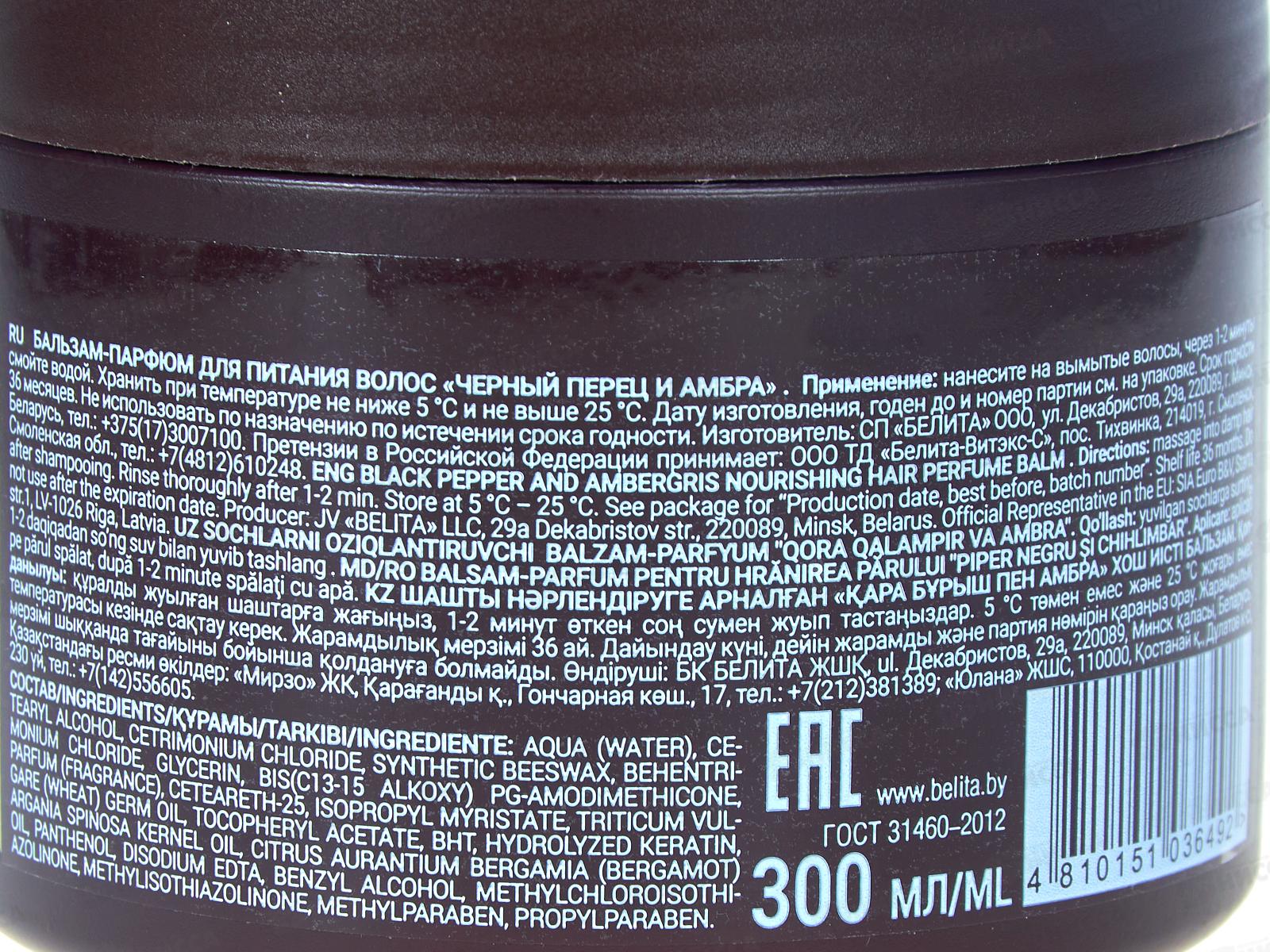 Завершите уход с бальзам-парфюмом «Черный перец и амбра», который обеспечивает интенсивное питание и защиту, используя ароматические ноты бергамота и базовые ноты ванили, древесины, кедра и амбры. Основные активные компоненты пантенол, масло аргана и гидролизованный кератин защищают и восстанавливают волосы, усиливая зеркальный блеск. Состав: Аква (Вода), Цетеариловый спирт, хлорид цетримония, Синтетический пчелиный воск, Бехентримоний хлорид, Глицерин, Бис (C13-15 Алкокси) PG-амодиметикон, Парфюмерия (отдушка), Цетеарет-25, изопропилмиристат, Масло зародышей пшеницы, токоферилацетат, BHT, гидролизованный кератин, Аргания колючая Масло косточек, Масло цитрусовых орехов, Масло бергамота, пантенол, Динатрий ЭДТА, Бензиловый спирт, Метилхлоризотиазолинон, Метилизотиазолинон, Метилпарабен, Пропилпарабен.