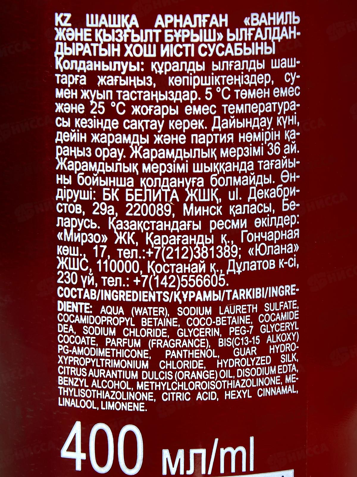 Этот шампунь не только очищает волосы, но и придаёт им невероятную мягкость и блеск благодаря уникальной формуле. Состав: Аква (вода), Лауретсульфат натрия, Кокамидопропилбетаин, Коко-Бетаин, Кокамид ДЭА, хлорид натрия, Глицерин, ПЭГ-7 Глицерилкокоат, Парфюмерия (отдушка), Бис (C13-15 Алкокси) PG-амодиметикон, Пантенол, Гидроксипропилтримониум хлорид, Гидролизованный шелк, Цитрусовые Aurantium Dulcis (Апельсин) Масло, Динатриевый ЭДТА, Бензиловый спирт, Метилхлоризотиазолинон, Метилизотиазолинон, Лимонная кислота, Гексилциннамал, Линалоол, Лимонен.