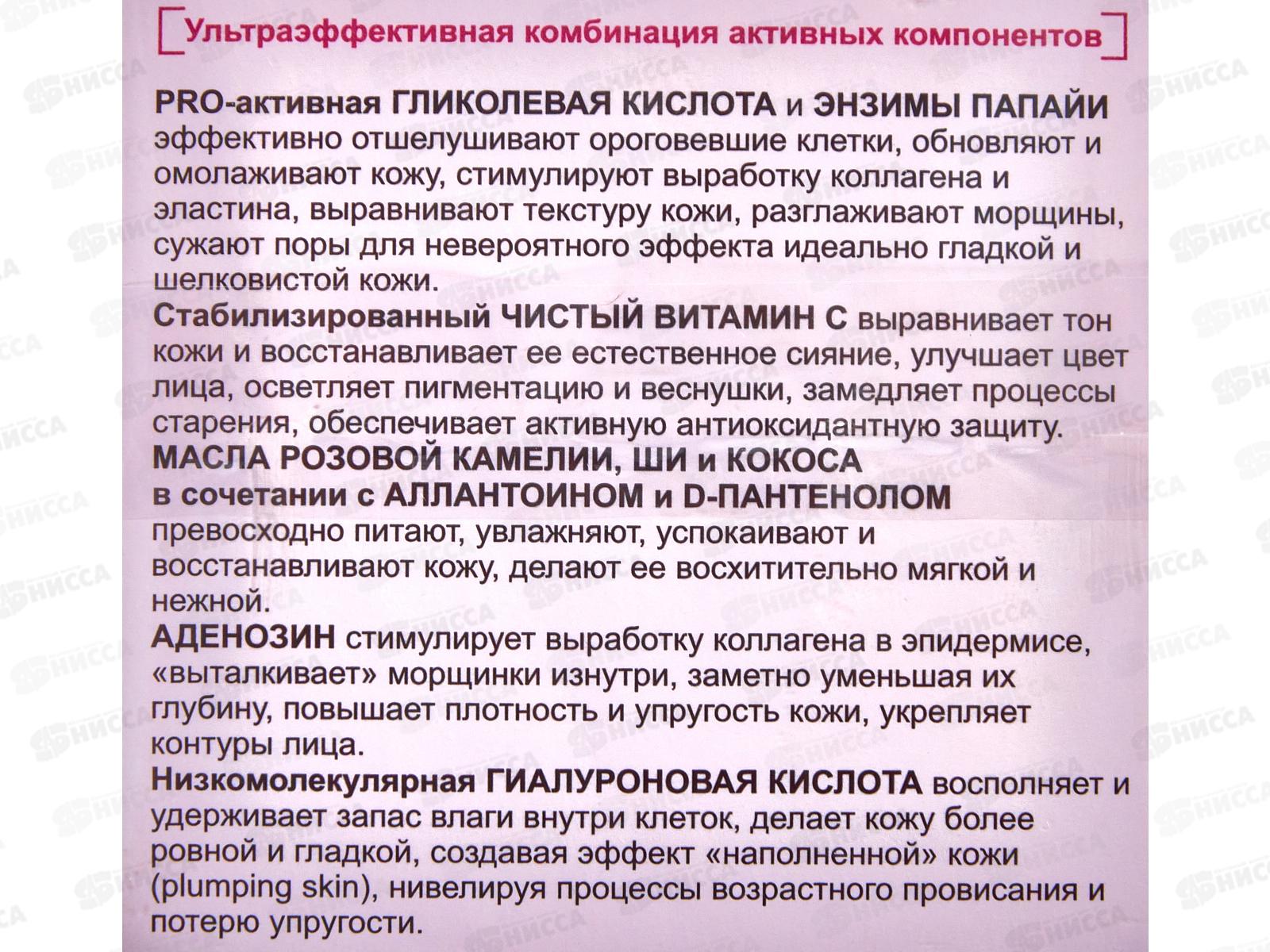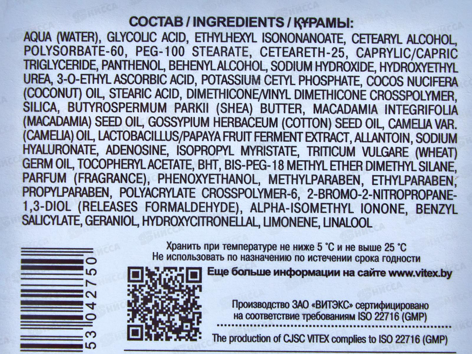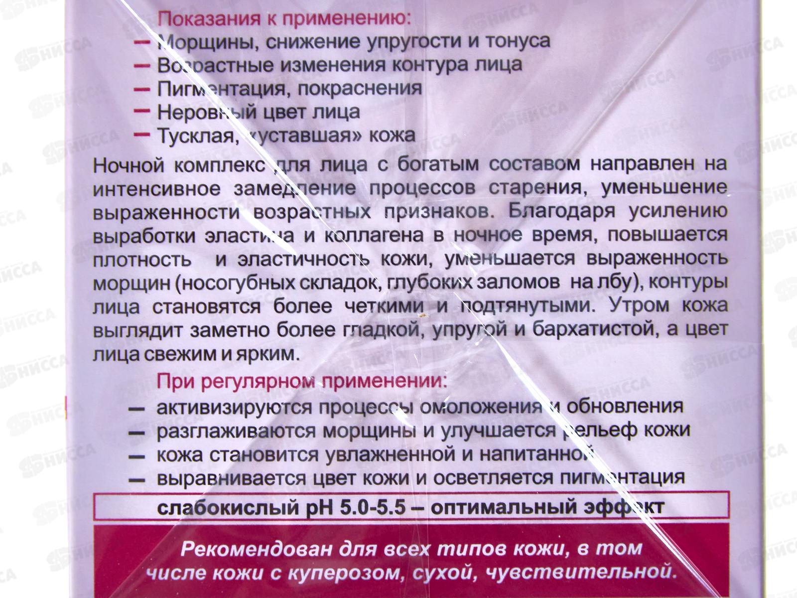 Ночной комплекс для лица с богатым составом направлен на интенсивное замедление процессов старения, уменьшение выраженности возрастных признаков. Благодаря усилению выработки эластина и коллагена в ночное время, повышается плотность и эластичность кожи, уменьшается выраженность морщин (носогубных складок, глубоких заломов на лбу), контуры лица становятся более четкими и подтянутыми. Утром кожа выглядит заметно более гладкой, упругой и бархатистой, а цвет лица свежим и ярким. Состав: Вода, гликолевая кислота, цетеариловый спирт, полисорбат-60, ПЭГ-100 стеарат, цетеарет-25, этилгексилизононаноат, глицерилтрикаприлат/капрат, пантенол, бегениловый спирт, гидроксид натрия, гидроксиэтилмочевина, 3-o-этиласкорбиновая кислота, цетилфосфат калия, масло Cocos Nucifera (кокосовое), стеариновая кислота, кроссполимер диметикона/винилдиметикона, диоксид кремния, бутиленгликоль, масло Butyrospermum parkii (ши), масло семян Macadamia Integrifolia (макадамии), масло семян Gossypium Herbaceum (хлопка), масло Camelia var. (камелии), ферментированный лактобациллами экстракт папайи, аллантоин, гиалуронат натрия, аденозин, изопропилмиристат, масло зародышей Triticum vulgare (пшеницы), токоферилацетат, БГТ, бис-ПЭГ-18 метиловый эфир диметилсилана, парфюмерная композиция, феноксиэтанол, метилпарабен, этилпарабен, пропилпарабен, кроссполимер полиакрилата-6, 2-бром-2-нитропропан-1,3-диол, альфа-изометилионон, бензилсалицилат, гераниол, гидроксицитронеллаль, лимонен, линалол.