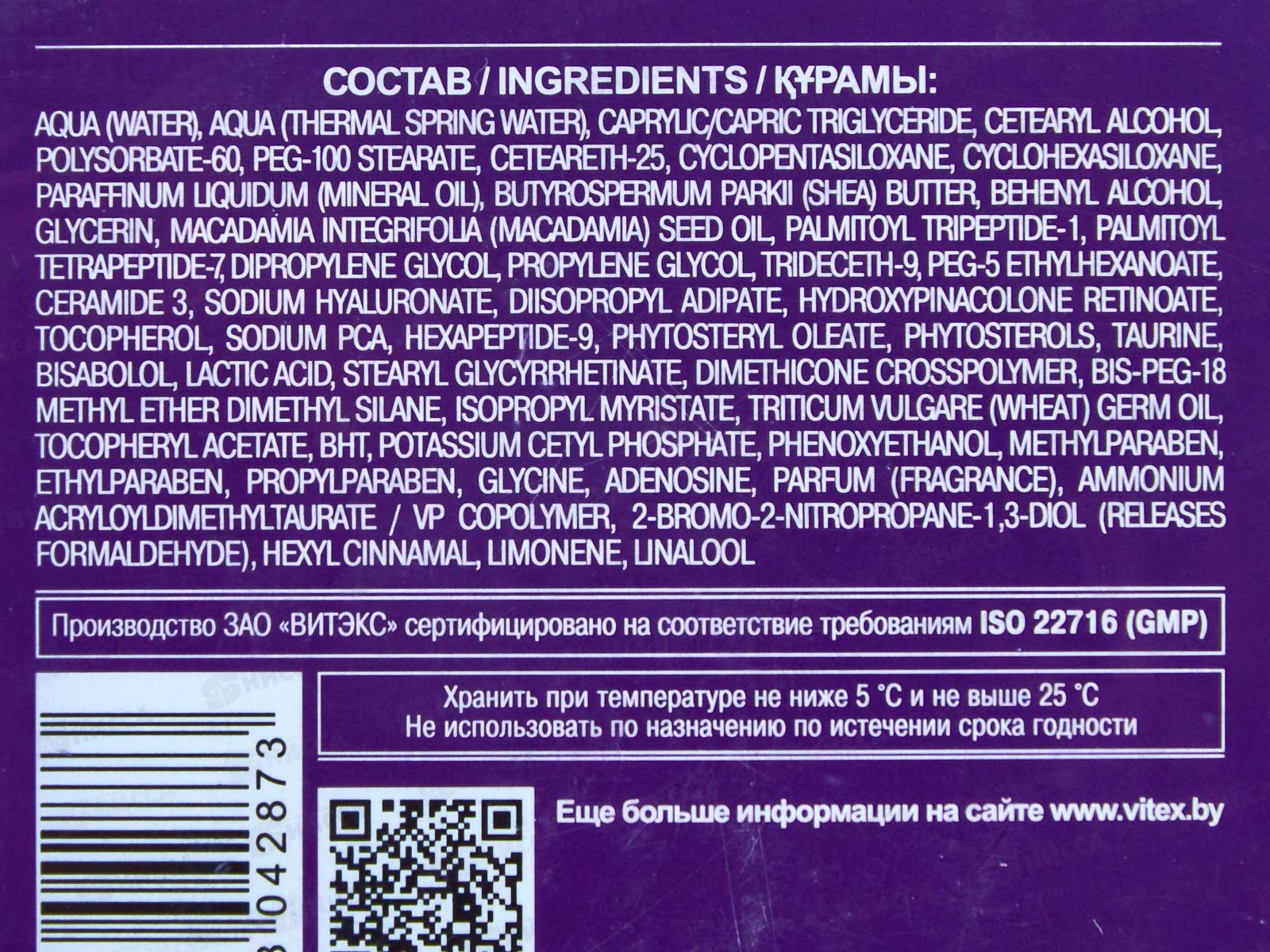 Активная формула крема создана для стимуляции процессов обновления в эпидермисе, усиления выработки коллагена и эластина, минимизации морщин и уменьшения провисания кожи. Состав: вода, термальная вода, глицерилтрикаприлат/капрат, цетеариловый спирт, полисорбат-60, ПЭГ-100 стеарат, цетеарет-25, циклопентасилоксан, циклогексасилоксан, вазелиновое масло, масло Butyrospermum parkii (ши), бегениловый спирт, глицерин, масло семян Macadamia Integrifolia (макадамии), пальмитоитрипептид-1, пальмитоилтетрапептид-7, дипропиленгликоль, пропиленгликоль, тридецет-9, ПЭГ-5 этилгексаноат, церамид 3, гиалуронат натрия, кроссполимер диметикона, бис-ПЭГ-18 метиловый эфир диметилсилана, диизопропиладипат, гидроксипиноколонретиноат, токоферол, пироглутамат натрия, гексапептид-9, фитостерилолеат, фитостеролы, аденозин, парфюмерная композиция, таурин, бисаболол, фарнезол, молочная кислота, стеарилглицирезинат, изопропилмиристат, масло зародышей Triticum vulgare (пшеницы), токоферилацетат, БГТ, цетилфосфат калия, феноксиэтанол, метилпарабен, этилпарабен, пропилпарабен, глицин, сополимер акрилоилдиметилтаурата аммония и винилпирролидона, 2-бром-2-нитропропан-1,3-диол, гексилциннамаль, лимонен, линалол.