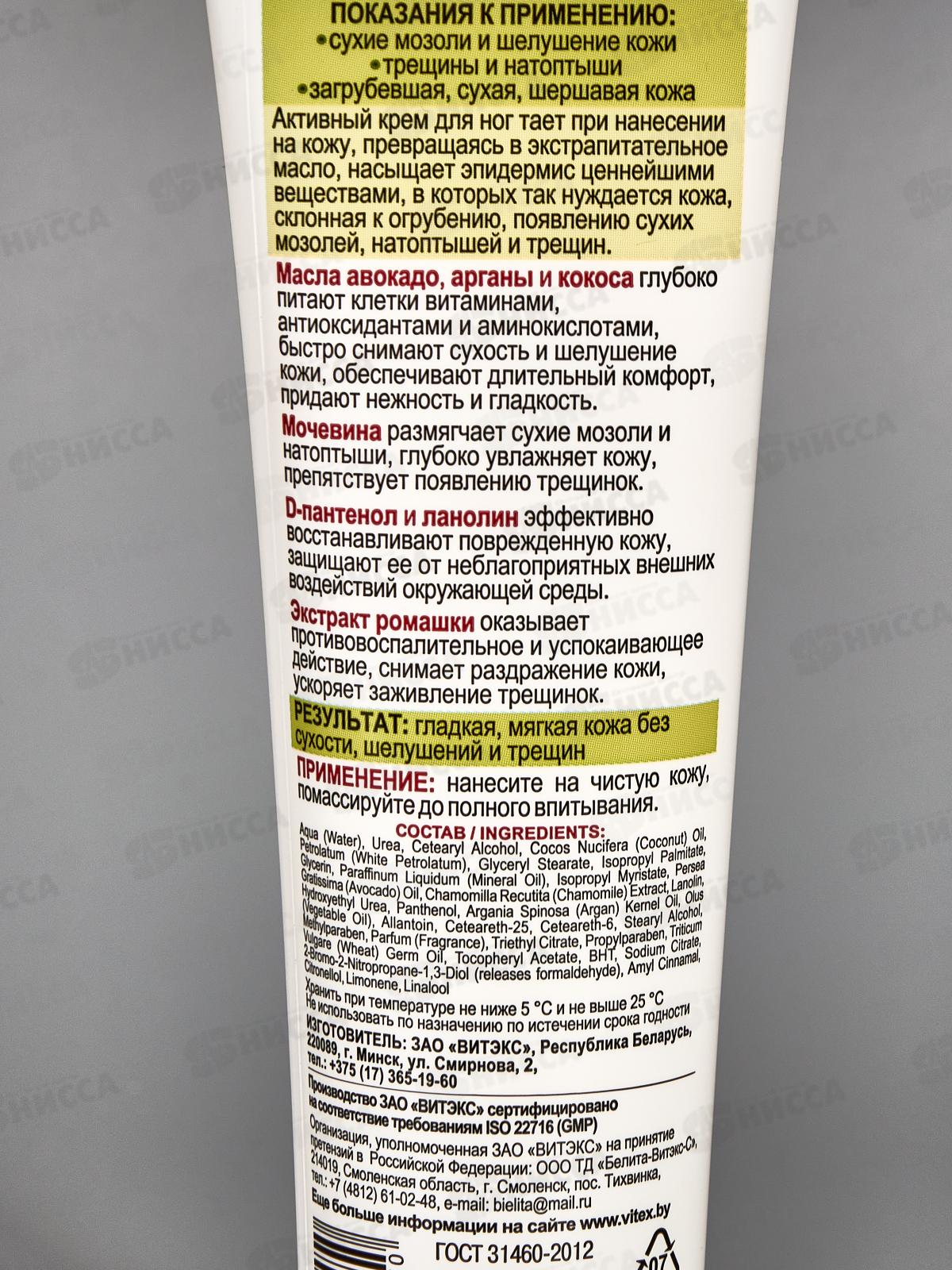 Активный крем для ног тает при нанесении на кожу, превращаясь в экстрапитательное масло, насыщает эпидермис ценнейшими веществами, в которых так нуждается кожа, склонная к огрубению, появлению сухих мозолей, натоптышей и трещин. Состав: вода, мочевина, цетеариловый спирт, масло Cocos Nucifera (кокосовое), вазелин, глицерилстеарат, изопропилпальмитат, глицерин, вазелиновое масло, изопропилмиристат, масло Persea Gratissima (авокадо), экстракт Chamomilla Recutita (ромашки), ланолин, гидроксиэтилмочевина, пантенол, масло косточек Argania Spinosa (аргана), растительное масло, аллантоин, цетеарет-25, цетеaрет-6, стеариловый спирт, метилпарабен, парфюмерная композиция, триэтилцитрат, пропилпарабен, масло зародышей Triticum vulgare (пшеницы), токоферилацетат, БГТ, цитрат натрия, 2-бром-2-нитропропан-1,3-диол, амилциннамаль, цитронеллол, лимонен, линалол.