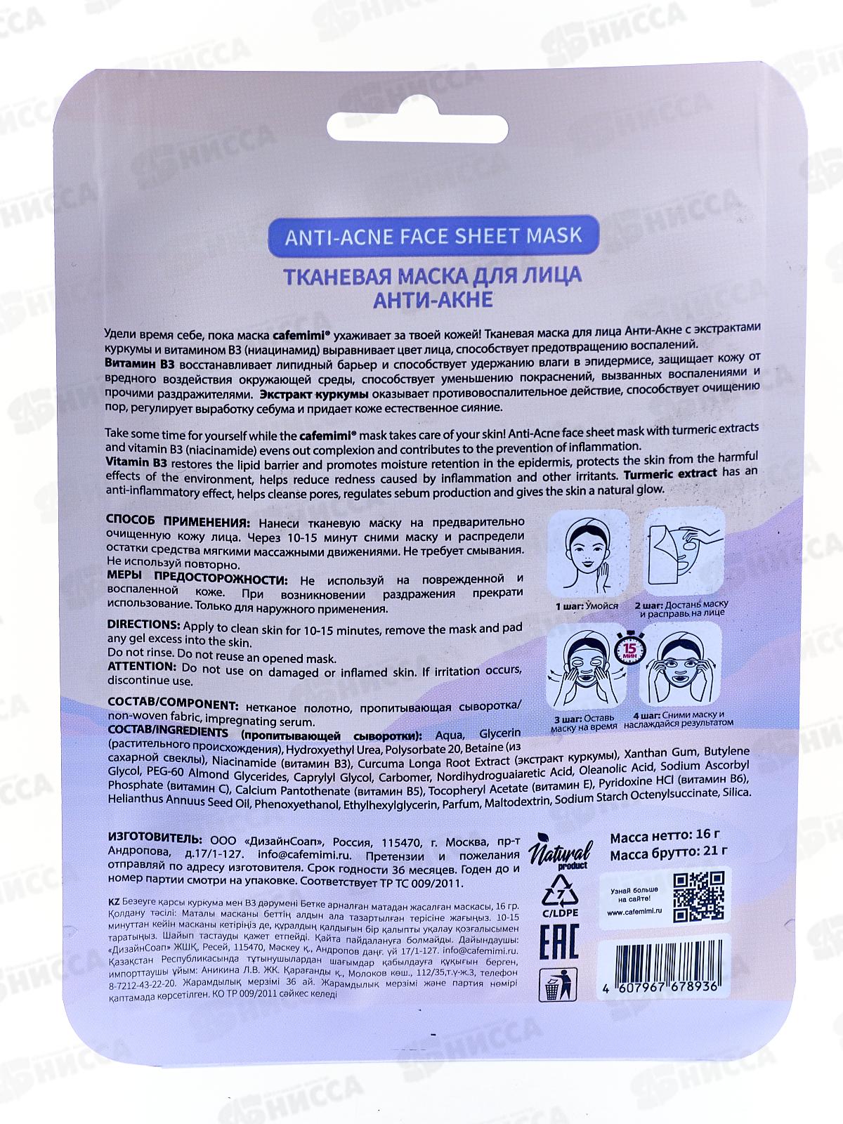 Кафе Мими Тканевая маска для лица Питательная 21г 573123