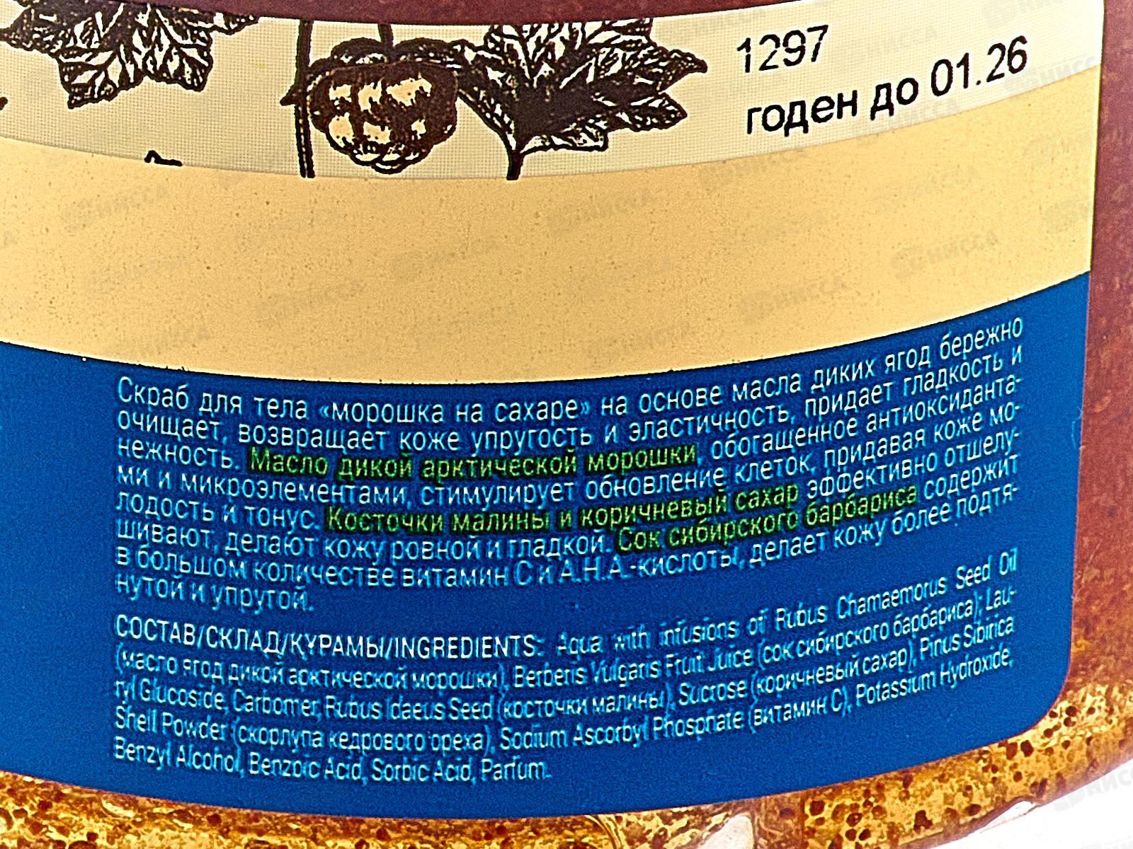 Активные компоненты: масло дикой морошки, косточки малины и соричневый сахар, сок сибирского бар