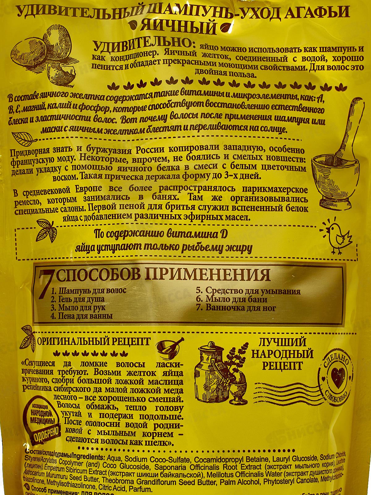 Рецепты Бабушки Агафьи Удивительная серия Агафьи шампунь Яичный 500мл *12 5402 дой-пак