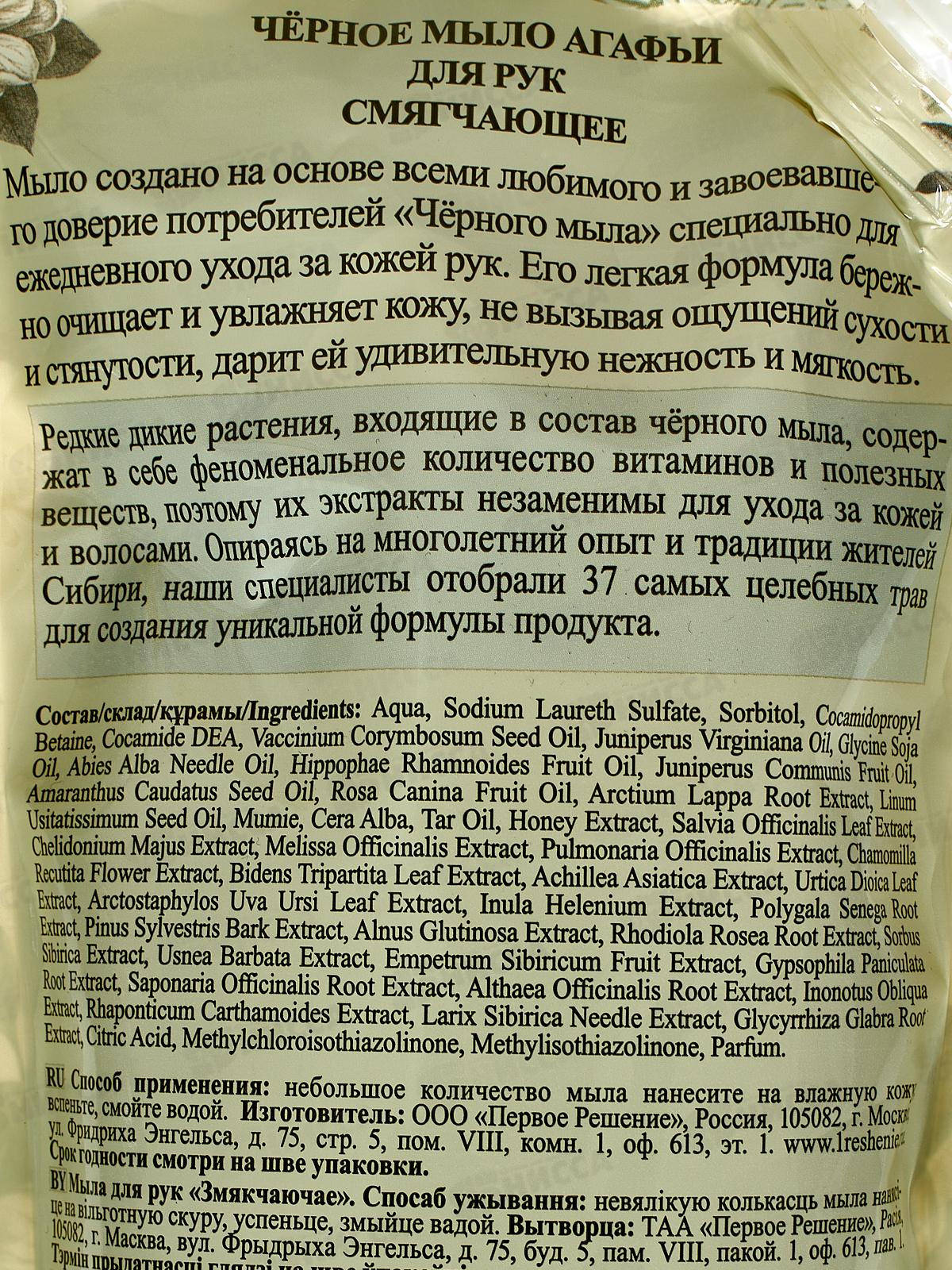 Состав: Aqua, Sodium Laureth Sulfate, Sorbitol, Cocamidopropyl Betaine, Cocamide DEA, Citric Acid, Vaccinium Corym Bosum Seed Oil, Juniperus Virginiana Oil, Glycine Soja Dauricus Oil, Abies Alba Leaf Oil, Hippophae Rhamnoides Fruit Oil, Juniperus Communis Fruit Oil, Amaranthus Caudatus Seed Oil, Rosa Canina Fruit Oil, Arctium Lappa Root Extract, Linum Usitatissimum Seed Oil, Mumie, Cera Alba, Tar Oil, Honey Extract, Salvia Officinalis Leaf Extract, Chelidonium Majus Extract, Melissa Officinalis Extract, Pulmonaria Officinalis Extract, Chamomilla Recutita Flower Extract, Bidens Tripartita Leaf Extract, Achillea Asiatica Extract, Urtica Dioica Leaf Extract, Arctostaphylos Uva Ursi Leaf Extract, Inula Helenium Extract, Polygala Senega Root Extract, Pinus Sylvestris Bark Extract, Alnus Glutinosa Extract, Rhodiola Rosea Root Extract, Sorbus Sibirica Extract, Usnea Barbata Extract, Empetrum Sibiricum Fruit Extract, Gypsophila Paniculata Root Extract, Saponaria Officinalis Root Extract, Althaea Officinalis Root Extract, Inonotus Obliqua Extract, Rhaponticum Carthamoides Extract, Larix Sibirica Needle Extract, Glycyrrhiza Glabra Root Extract, Kathon, Parfum.