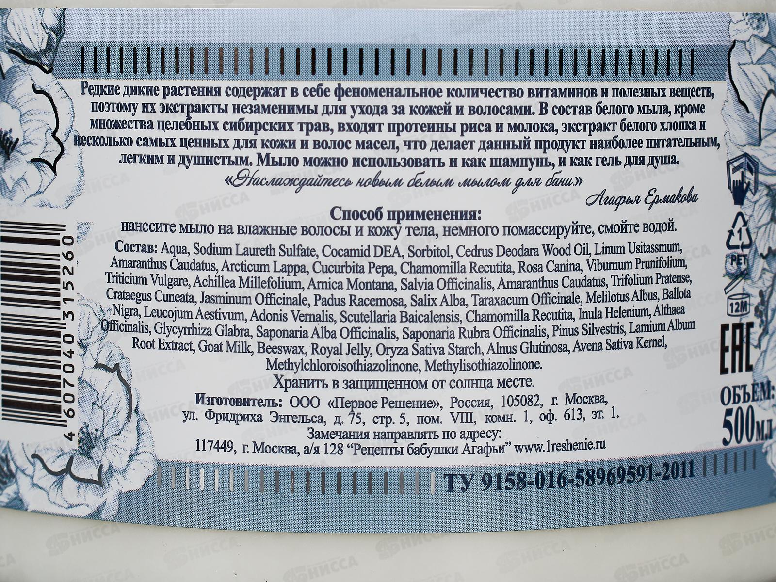 Рецепты Бабушки Агафьи мыло для бани Белое мыло 500мл *6 5260