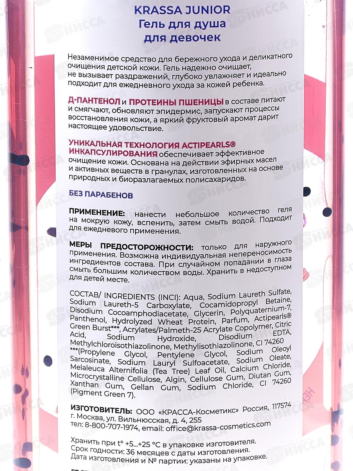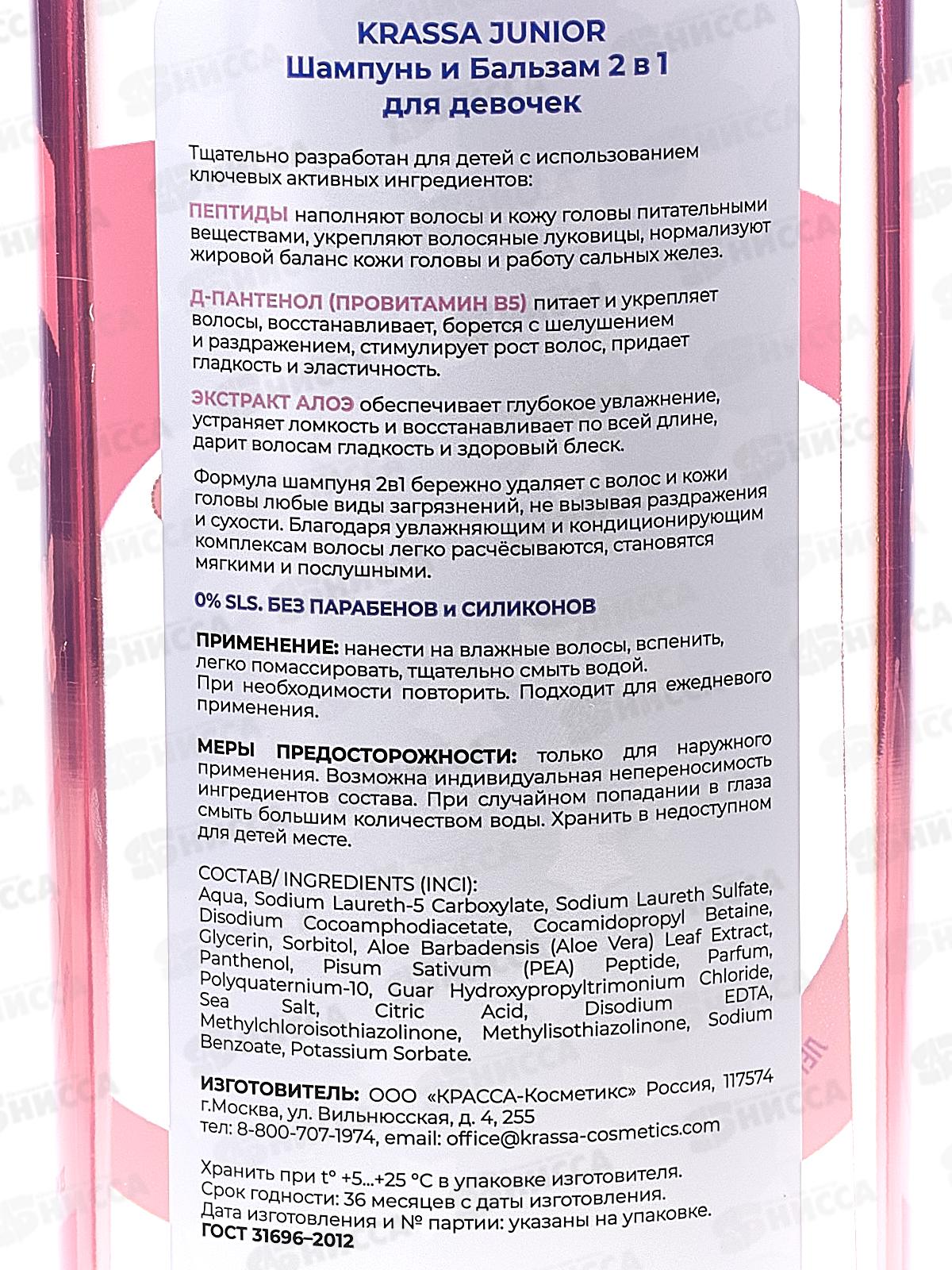 Подарочный набор детской косметики KRASSA JUNIOR для девочек по уходу за волосами и телом. Уходовая косметика эффективно и глубоко очищает кожу, оставляя ее мягкой и увлажненной на целый день. Ароматизированный питательный гель для душа надежно очищает, не вызывает раздражений, глубоко увлажняет и идеально подходит для ежедневного ухода за кожей ребенка. Пептиды, входящие в состав шампуня для девочек, наполняют волосы и кожу головы питательными веществами, укрепляют волосяные луковицы, нормализуют жировой баланс кожи головы и работу сальных желез. Д-Пантенол (провитамин B5) питает и укрепляет волосы, восстанавливает, борется с шелушением и раздражением, стимулирует рост волос, придает гладкость и эластичность. Экстракт Алоэ обеспечивает питание и глубокое увлажнение, устраняет ломкость и восстанавливает по всей длине, дарит волосам гладкость и здоровый блеск.
