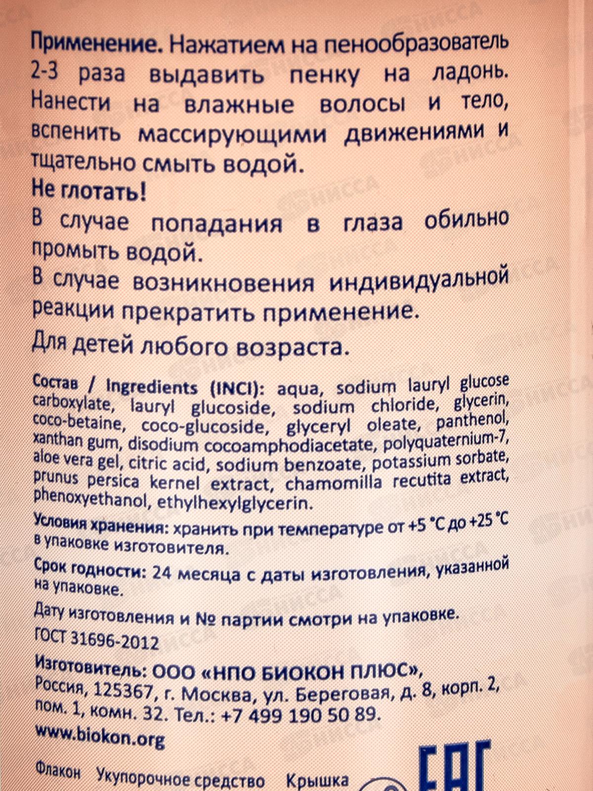 Состав: вода, лаурилглюкозы карбоксилат натрия, лаурилглюкозид, хлорид натрия, глицерин, S-кокобетаин, кокоглюкозид, глицерилолеат, пантенол, ксантановая камедь, динатрия кокоамфодиацетат, поликватерниум-7, гель алоэ вера, лимонная кислота, бензоат натрия, сорбат калия, экстракт косточек персика, экстракт ромашки аптечной, феноксиэтанол, этилгексилглицерин.