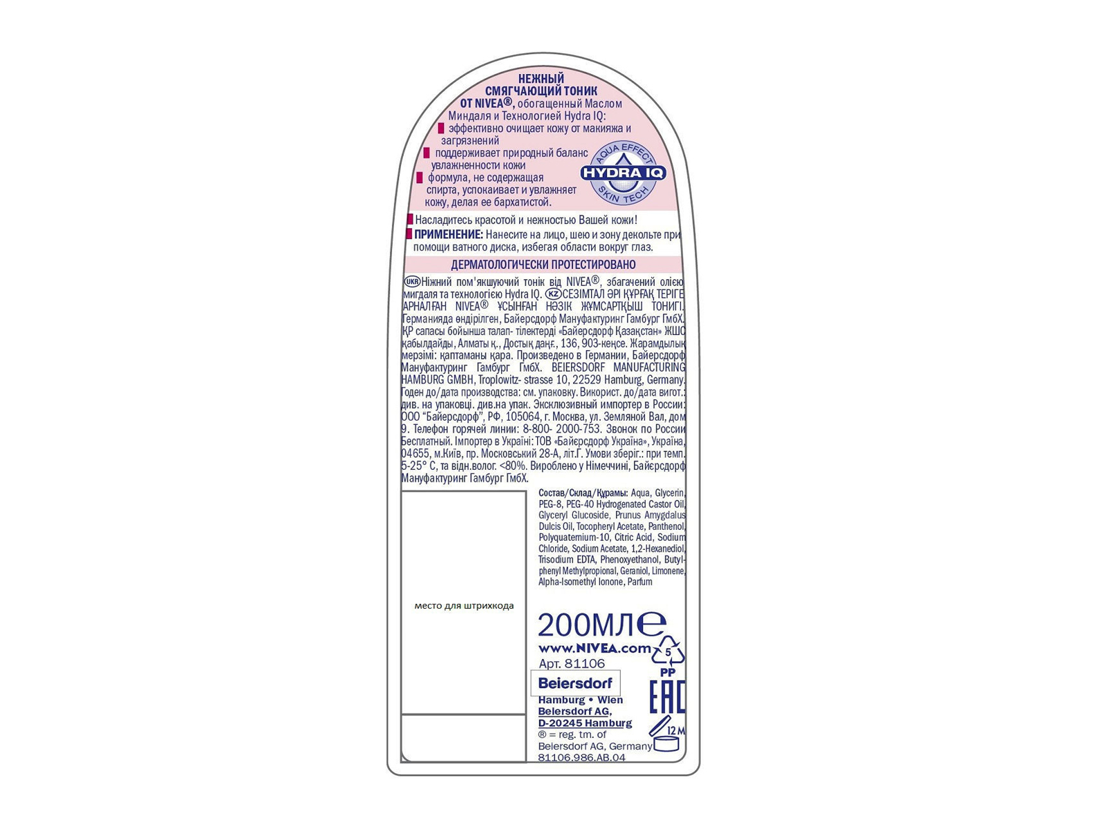 Нежный смягчающий тоник для лица NIVEA с миндальным маслом и мягкой водой – идеален для ежедневного ритуала ухода за кожей, - бережного очищения кожи с увлажняющим эффектом. Успокаивает раздраженную кожу, не пересушивая и поддерживая естественный баланс увлажненности. Состав: Aqua, Glycerin, PEG-8, PEG-40 Hydrogenated Castor Oil, Prunus Amygdalus Dulcis Oil, Polyquaternium-10, Citric Acid, Phenoxyethanol, 1,2-Hexanediol, Trisodium EDTA, Geraniol, Benzyl Alcohol, Linalool, Alpha-Isomethyl Ionone, Limonene, Parfum.