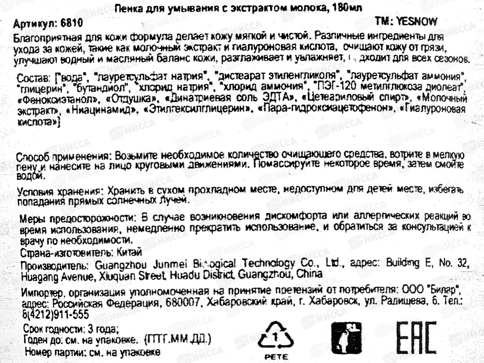 Yesnow Пенка для умывания с Экстрактом молока 180мл