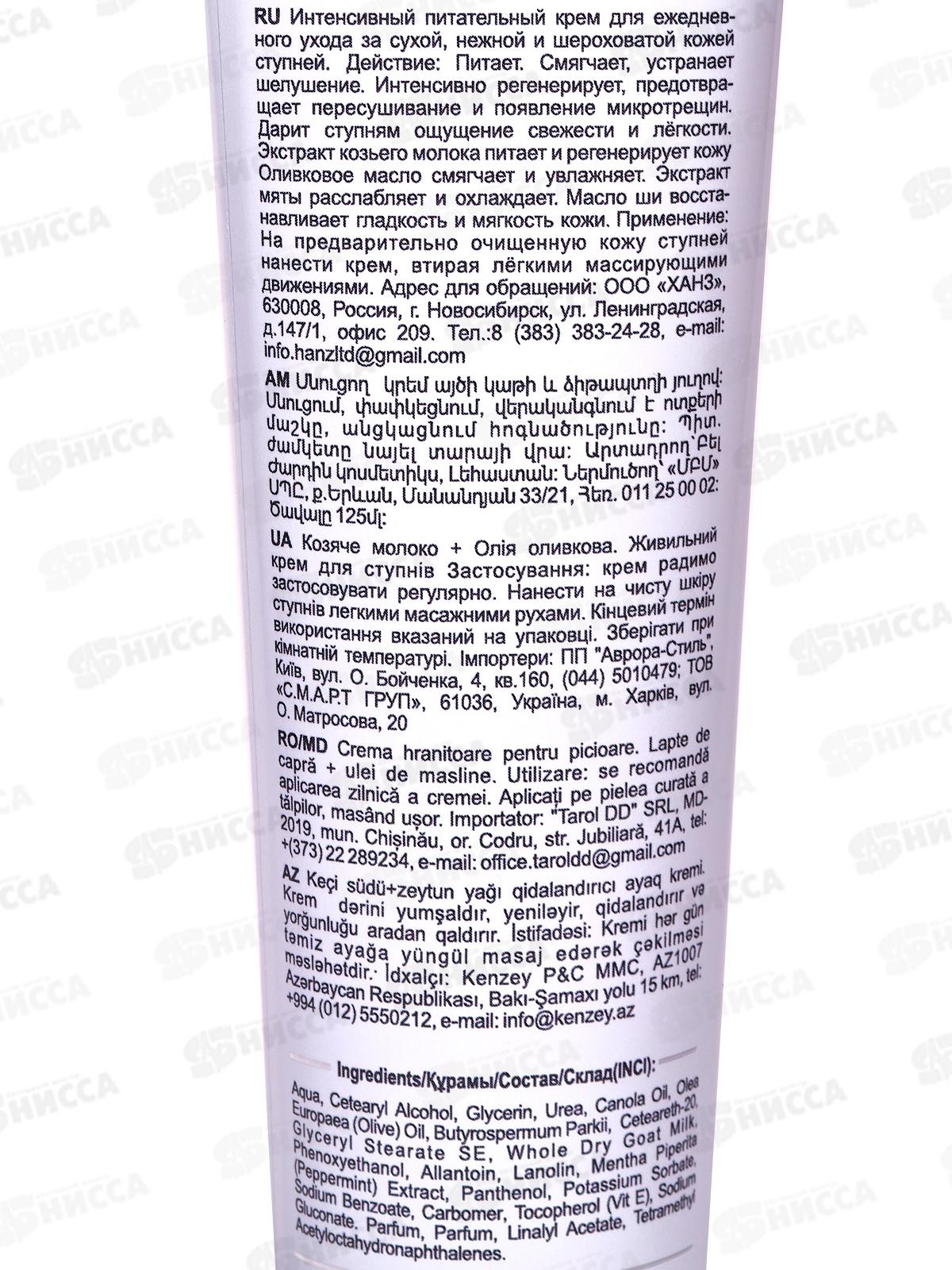 Питательный крем для ступней «Козье молоко и оливковое масло» от польского бренда Belle Jardin – настоящая панацея против усталости, мышечного напряжения и мелких несовершенств на ступнях. Goat’s Milk & Olive Oil способствует интенсивному увлажнению загрубевших участков кожи, стимулирует их смягчение и ускоряет процесс заживления повреждений. Витаминное средство эффективно избавляет от ороговевшего слоя, предотвращает образование трещин и делает все, чтобы каждый ваш шаг сопровождался легкостью, уверенностью и точностью! Состав: Вода, Глицерин, Цетеариловый спирт, Мочевина, Жидкий парафин, Ланолин, Бутиросперм Паркжи (Масло Ши), Фруктовое масло European Oils, Экстракт козьего молока, Цетеарет-20, Пропиленгликоль, Глицерилстеарат Se, Белый воск (пчелиный воск), Экстракт листьев мяты перечной, экстракт листьев подорожника ланцетного, токоферилацетат ((Е), Карбомер, Триэтаноламин, феноксиэтанол, бензоат натрия, сорбат калия, Тетранатриевый Эдта, Парфюмированная вода.