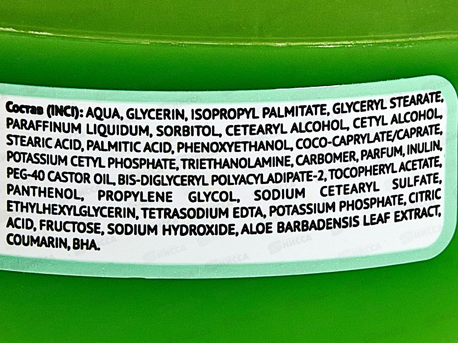 Состав: AQUA, GLYCERIN, ISOPROPYL PALMITATE, GLYCERYL STEARATE, PARAFFINUM LIQUIDUM, SORBITOL, CETEARYL ALCOHOL, CETYL ALCOHOL, STEARIC ACID, PALMITIC ACID, PHENOXYETHANOL, COCO-CAPRYLATE/CAPRATE, POTASSIUM CETYL PHOSPHATE, TRIETHANOLAMINE, CARBOMER, PARFUM, INULIN, PEG-40 CASTOR OIL, BIS-DIGLYCERYL POLYACYLADIPATE-2, TOCOPHERYL ACETATE, PANTHENOL, PROPYLENE GLYCOL, SODIUM CETEARYL SULFATE, ETHYLHEXYLGLYCERIN, TETRASODIUM EDTA, POTASSIUM PHOSPHATE, CITRIC ACID, FRUCTOSE, SODIUM HYDROXIDE, ALOE BARBADENSIS LEAF EXTRACT, COUMARIN, BHA.