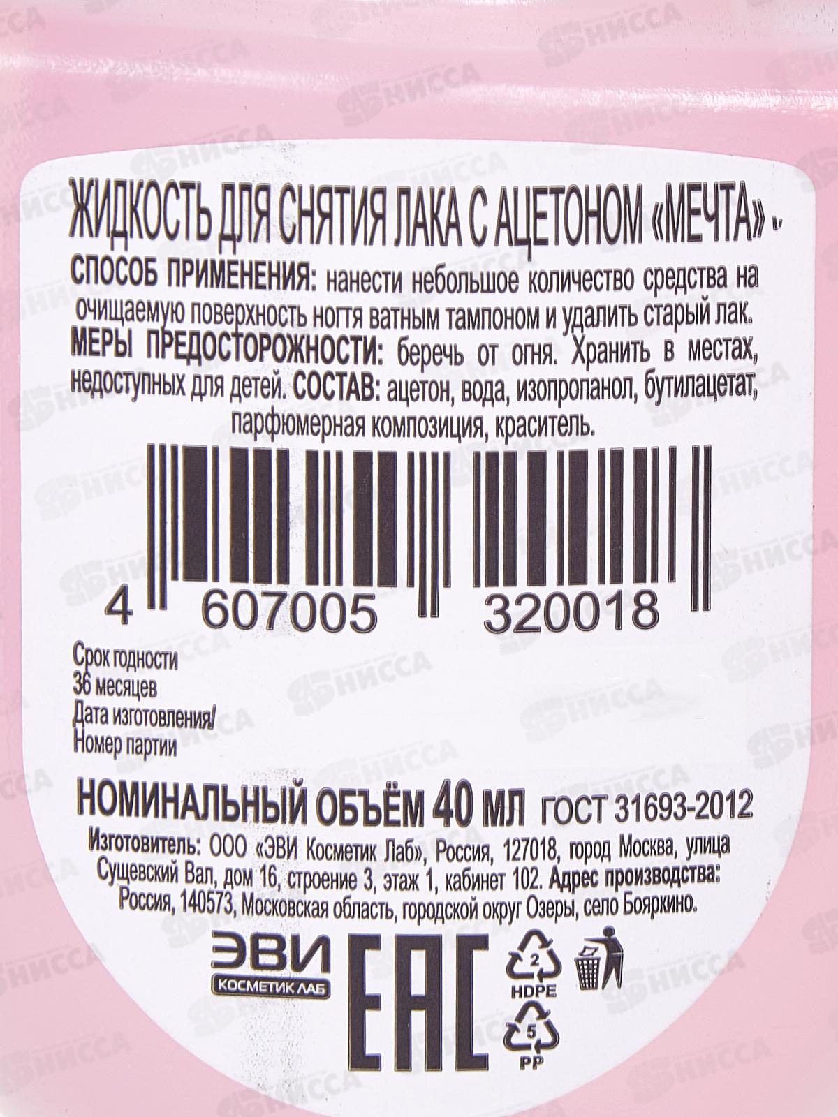 Жидкость для снятия лака «Мечта», в пластиковом флаконе, 40 мл. Быстро и эффективно удаляет любой лак, не повреждая ногтевую пластину. Имеет приятный аромат, что делает процедуру более комфортной. Средство эффективно справляется с любым лаком, противодействует попаданию красящих пигментов в ногтевую пластину. Добавка изопропанола и бутилацетата смягчает действие ацетона.