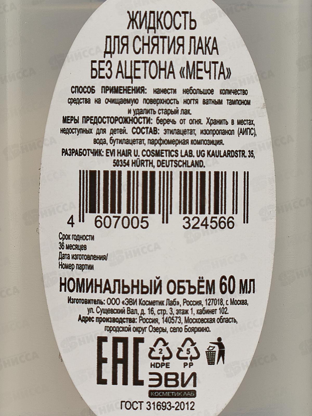 Жидкость для снятия лака Мечта без ацетона 60мл пластиковый флакон *35