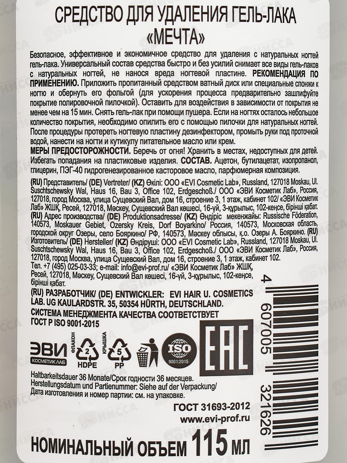 Средство для удаления гель - лака Мечта, 115 мл. Безопасное, эффективное и экономичное средство для удаления гель-лака с натуральных ногтей. Эффективный состав средства быстро и без усилий снимает все виды гель-лаков не нанося вреда ногтевой пластине.