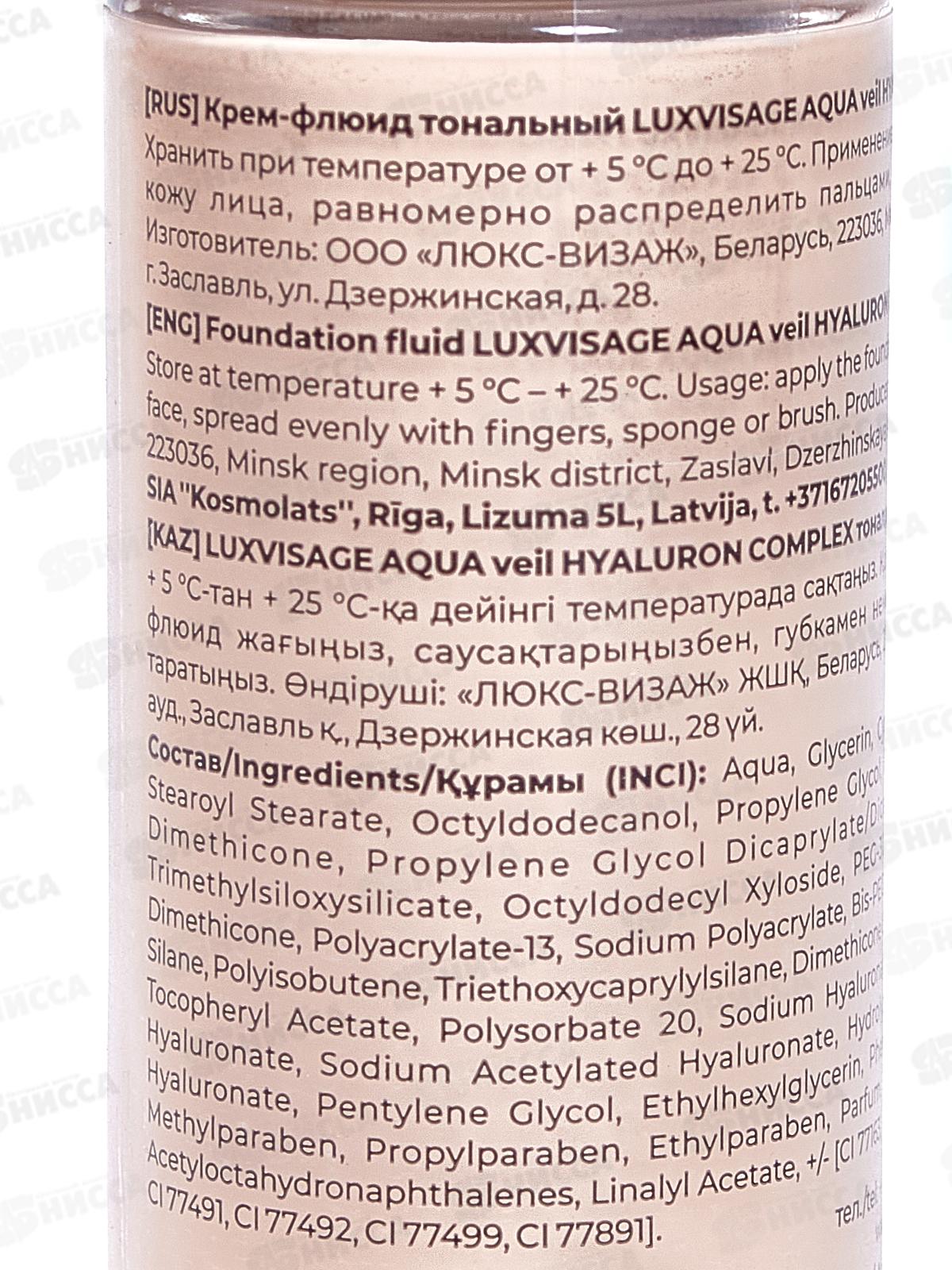 Состав: вода, Глицерин, Циклопентасилоксан, Изоцетилстеароилстеарат, Октилдодеканол, Пропиленгликоль, Циклогексасилоксан, Цетилдиметикон, Пропиленгликоль дикаприлат/дикапрат, C13-15 алкан, Триметилсилоксисиликат, Октилдодецилксилозид, ПЭГ-30 диполигидроксистеарат, Диметикон, Полиакрилат-13, Полиакрилат натрия, Бис-ПЭГ-18 метиловый эфир диметилсилан, Полиизобутен, Триэтоксикаприлилсилан, Диметикон кроссполимер, Гексадецен, Токоферилацетат, Полисорбат 20, Кроссполимер гиалуроната натрия, Гиалуронат натрия, Ацетилированный гиалуронат натрия, Гидролизованный гиалуронат натрия, Пентиленгликоль, Этилгексилглицерин, феноксиэтанол, метилпарабен, пропилпарабен, этилпарабен, парфюмерная композиция, тетраметилацетилоктагидронафталины, линалилацетат, +/- [CI 77163, CI 77491, CI 77492, CI 77499, CI 77891].