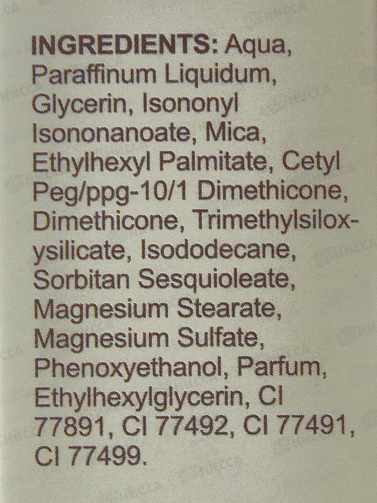 Состав: вода, вазелиновое масло, глицерин, изононилизононаноат, слюда, этилгексилпальмитат, цетиловый ПЭГ/ППГ-10/1 диметикон, диметикон, триметилсилоксисиликат, изододекан, сесквиолеат сорбитана, стеарат магния, сульфат магния, феноксиэтанол, отдушка, этилгексилглицерин, cl77891, cl77492, cl77491, cl77499.