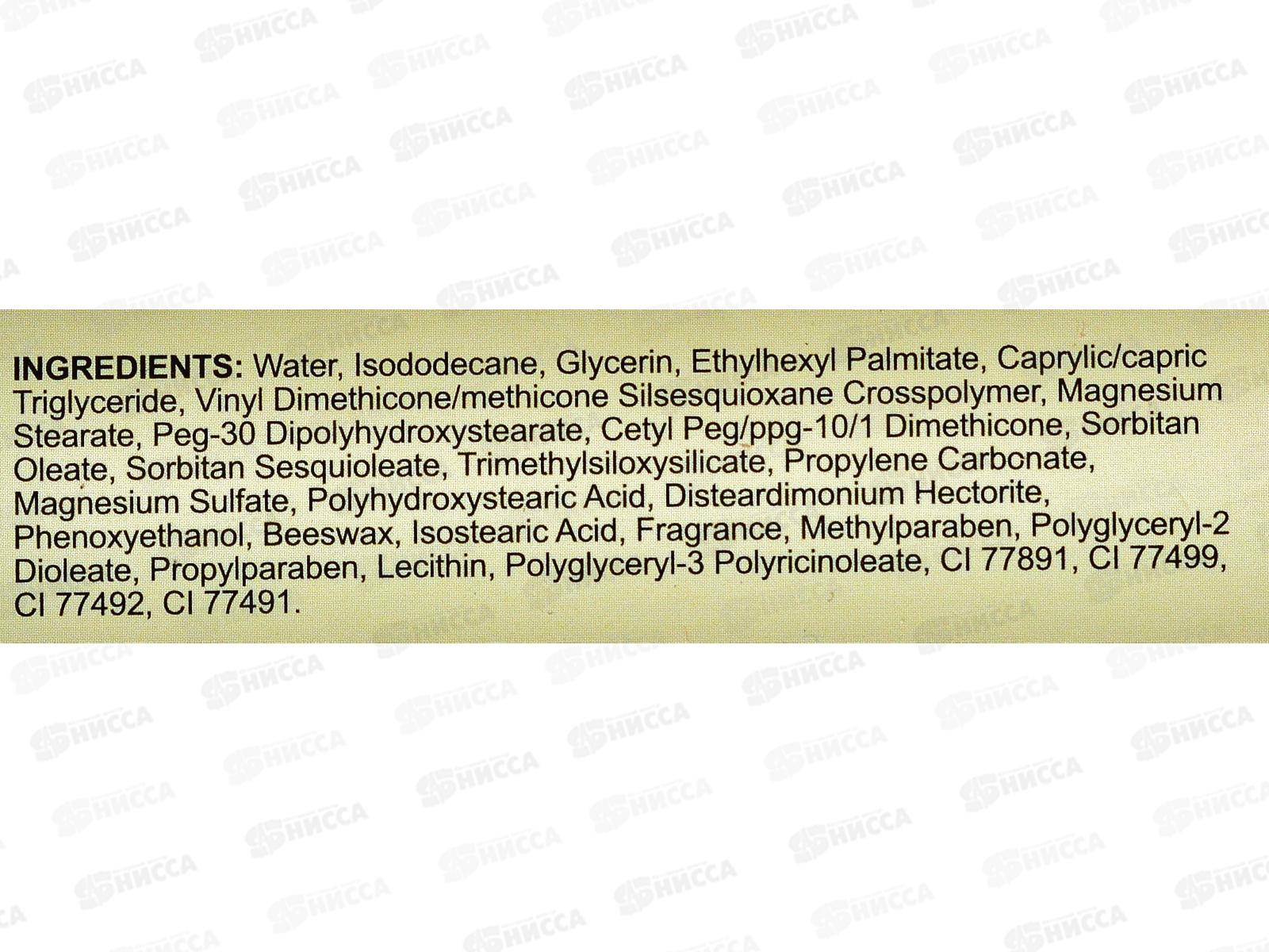 Состав: вода, изододекан, глицерин, этилгексилпальмитат, каприловый/каприновый триглицерид, винилдиметикон/метикон силсесквиоксан кроссполимер, стеарат магния, ПЭГ-30 диполигидроксистеарат, цетил ПЭГ/ППГ-10/1 диметикон, олеат сорбитана, сесквиолеат сорбитана, триметилсилоксисиликат, пропиленкарбонат, сульфат магния, полигидроксистеариновая кислота, дистеардимония гекторит, феноксиэтанол, пчелиный воск, изостеариновая кислота, отдушка, метилпарабен, полиглицерил-2 диолеат, пропилпарабен, лецитин, полиглицерил-3 полирицинолеат, CI 77891, CI 77499, CI 77492, CI 77491.