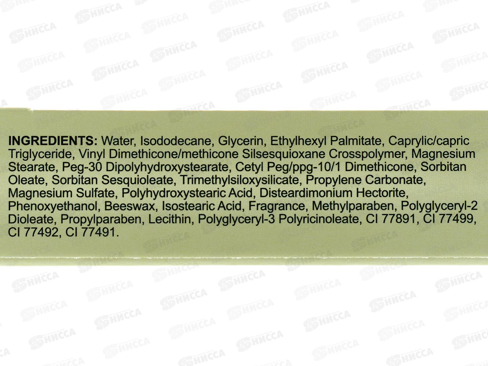 Состав: вода, изододекан, глицерин, этилгексилпальмитат, каприловый/каприновый триглицерид, винилдиметикон/метикон силсесквиоксан кроссполимер, стеарат магния, ПЭГ-30 диполигидроксистеарат, цетил ПЭГ/ППГ-10/1 диметикон, олеат сорбитана, сесквиолеат сорбитана, триметилсилоксисиликат, пропиленкарбонат, сульфат магния, полигидроксистеариновая кислота, дистеардимония гекторит, феноксиэтанол, пчелиный воск, изостеариновая кислота, отдушка, метилпарабен, полиглицерил-2 диолеат, пропилпарабен, лецитин, полиглицерил-3 полирицинолеат, CI 77891, CI 77499, CI 77492, CI 77491.