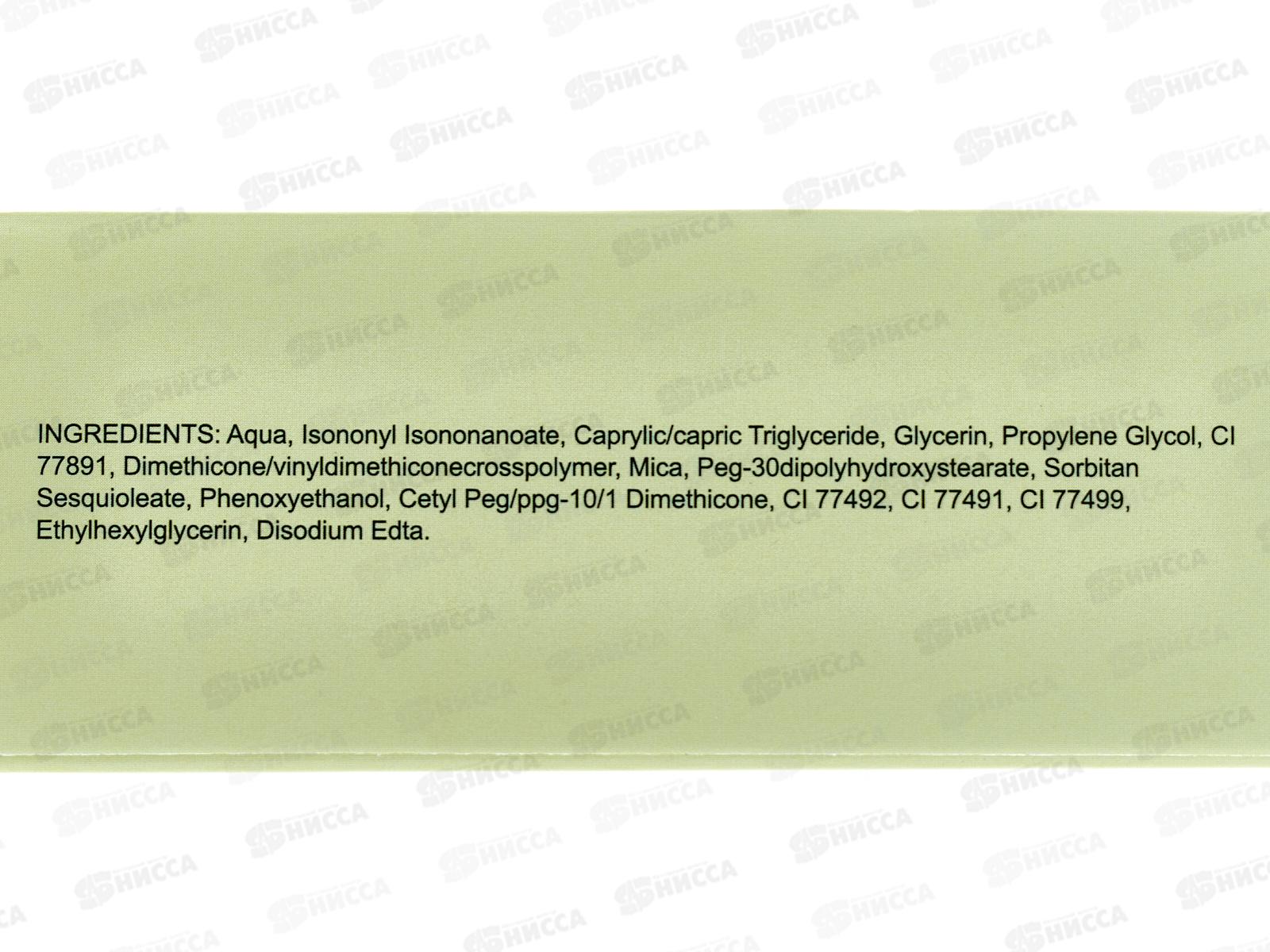 Состав: вода, Изононилизононаноат, каприловый/каприновый триглицерид, глицерин, пропиленгликоль, Cl 77891, диметикон/винилдиметикон кроссполимер, слюда, ПЭГ-30диполигидроксистеарат, сорбитансесквиолеат, феноксиэтанол, цетил ПЭГ/ППГ-10/1 диметикон, CI 77492, CI 77491, CI 77499, этилгексилглицерин, динатриевая ЭДТА.