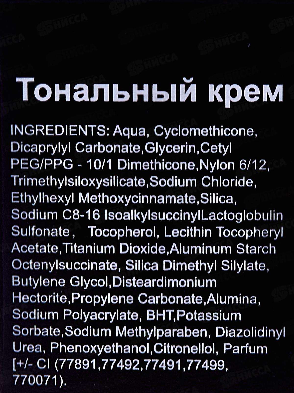 Состав: вода, циклометикон, дикаприлилкарбонат, глицерин, цетиловый ПЭГ/ППГ-10/1 диметикон, нейлон 6/12, триметилсилоксисиликат, хлорид натрия, этилгексилметоксициннамат, диоксид кремния, натрий c8-16 изоалкилсукциниллактоглобулинсульфонат, токоферол, лецитинтокоферолацетат, диоксид титана, алюминийкрахмалоктенилсукцинат, диметилсилилат кремния, бутиленгликоль, дистеардимония гекторит, пропиленкарбонат, оксид алюминия, полиакрилат натрия, бутилгидрокситолуол, сорбат калия, метилпарабен натрия, диазолидинилмочевина, феноксиэтанол, цитронеллол, отдушка [+/- CI (77891, 77492, 77491, 77499, 770071)].