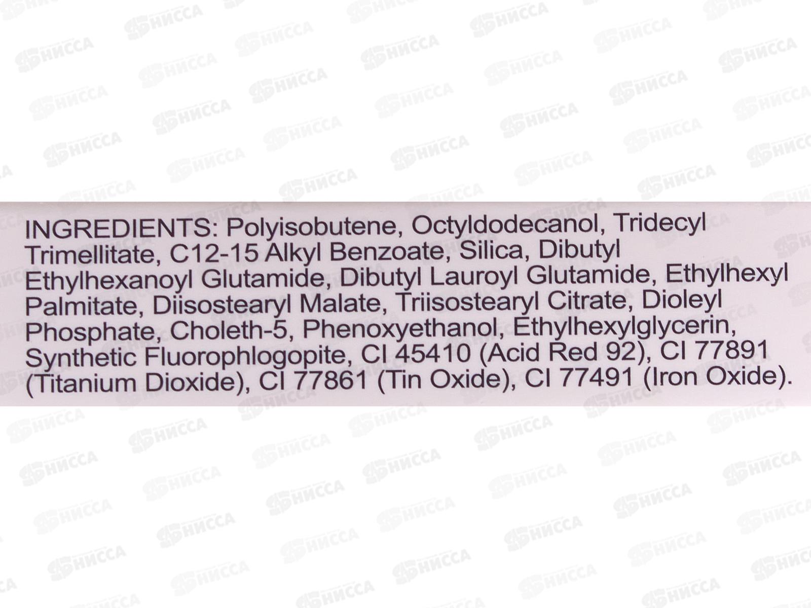 Состав: полиизобутен, Октилдодеканол, Тридецилтримеллитат, алкилбензоат C12-15, Диоксид кремния, Дибутилэтилгексаноилглутамин, Дибутиллауроилглутамат, Этилгексилпальмитат, Диизостеарилмалат, Триизостеарилцитрат, Диолилфосфат, Холет-5, Феноксиэтанол, Этилгексилглицерин, Синтетический фторфлогопит, Cl 45410 (Кислотно-красный 92), Cl 77891 (диоксид титана), Cl 77861 (оксид олова), Cl 77491 (оксид железа).