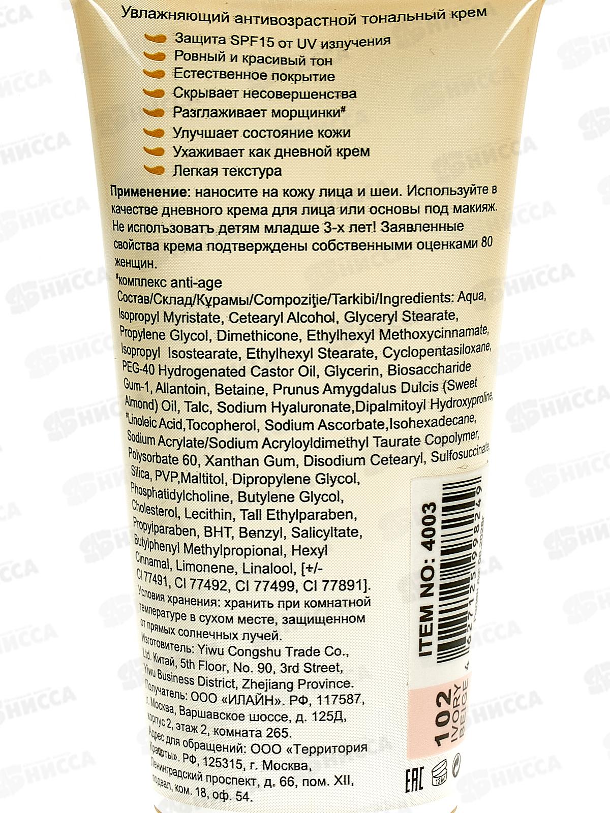 Состав: вода, изопропилмиристат, цетеариловый спирт, глицерилстеарат, пропиленгликоль, диметикон, этилгексилметоксициннамат, изопропилизостеарат, этилгексилстеарат, циклопентасилоксан, ПЭГ-40 гидрогенизированное касторовое масло, глицерин, биосахаридная камедь-1, аллантоин, бетаин, масло сладкого миндаля (Prunus Amygdalus Dulcis), тальк, гиалуронат натрия, дипальмитоилгидроксипролин, линолевая кислота, токоферол, аскорбат натрия, изогексадекан, сополимер акрилата натрия/акрилоилдиметилтаурата натрия, полисорбат 60, ксантановая камедь, динатрия цетеарилсульфосукцинат, диоксид кремния, ПВП, мальтит, дипропиленгликоль Гликоль, фосфатидилхолин, бутиленгликоль, холестерин, лецитин, этилпарабен, пропилпарабен, BHT, бензил, салицилтат, бутилфенилметилпропиональ, гексилциннамаль, лимонен, линалоол, [+/- CI 77491, CI 77492, CI 77499, CI 77891].