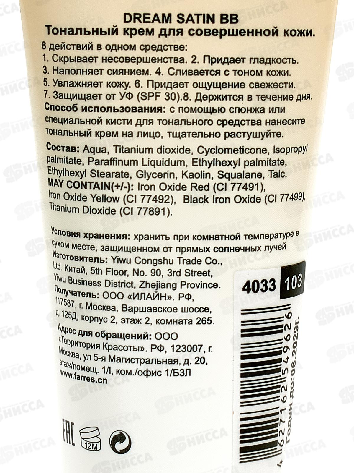 Farres тональный крем ВВ D.S. увлажняющий SPF-30 4033-103 40мл фарфор *3