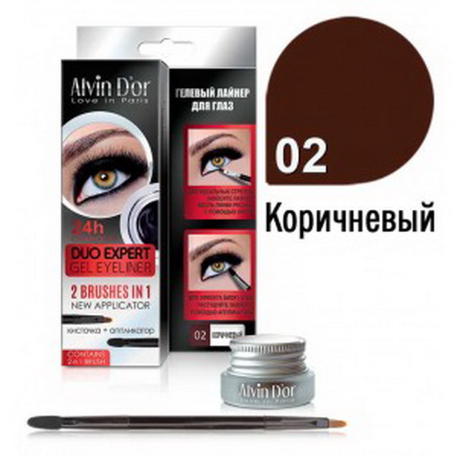 Профессиональный стойкий гелевый лайнер для глаз от бренда Alvin D'or тон № 02 (Brown), позволяет легко нарисовать безупречные стрелки любой толщины. Формула содержит стойкие пигменты, с которыми макияж будет выглядеть безупречным 24 часа. Идеально подходит как для естественного макияжа, так и для создания смелого яркого образа и эффекта Smoky Eye. Уникальная текстура обеспечивает мягкое и комфортное нанесение, а двойная профессиональная кисточка позволяет подвести глаза и при необходимости сделать растушёвку.