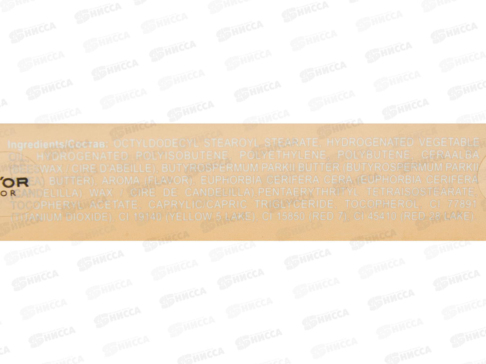Состав: октилдодецилстеароилстеарат, гидрогенизированное растительное масло, гидрогенизированный полиизобутен, полиэтилен, полибутен, ceraalba (пчелиный воск / cire d'abeille), масло butyrospermum parkii (масло ши) (butyrospermum parkii), ароматизатор (вкус), euphorbia cerifera cera (воск канделильи / cire de candelilla), пентаэритритилтетраизостеарат, токоферилацетат, каприловый/капровый триглицерид, токоферол, ci 77891 (диоксид титана), ci 19140 (желтый 5 озеро), ci 15850 (красный 7), ci 45410 (красный 28 озеро).
