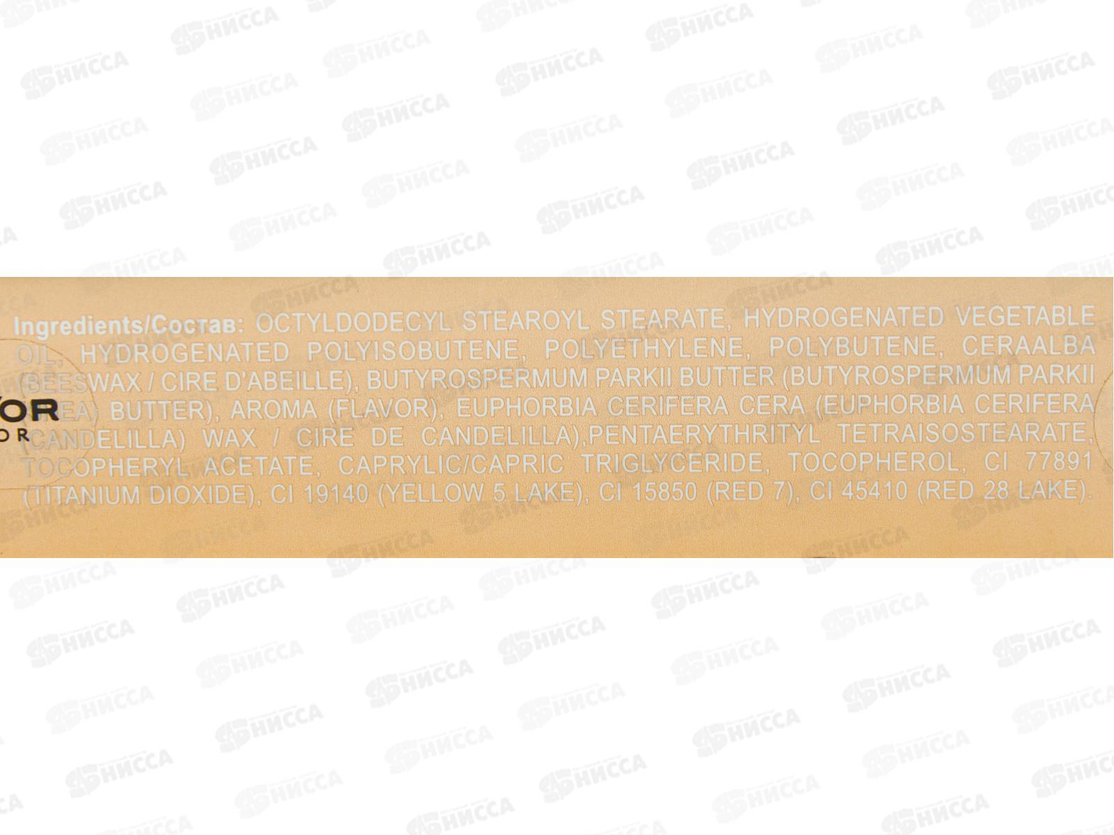 Состав: октилдодецилстеароилстеарат, гидрогенизированное растительное масло, гидрогенизированный полиизобутен, полиэтилен, полибутен, ceraalba (пчелиный воск / cire d'abeille), масло butyrospermum parkii (масло ши) (butyrospermum parkii), ароматизатор (вкус), euphorbia cerifera cera (воск канделильи / cire de candelilla), пентаэритритилтетраизостеарат, токоферилацетат, каприловый/капровый триглицерид, токоферол, ci 77891 (диоксид титана), ci 19140 (желтый 5 озеро), ci 15850 (красный 7), ci 45410 (красный 28 озеро).