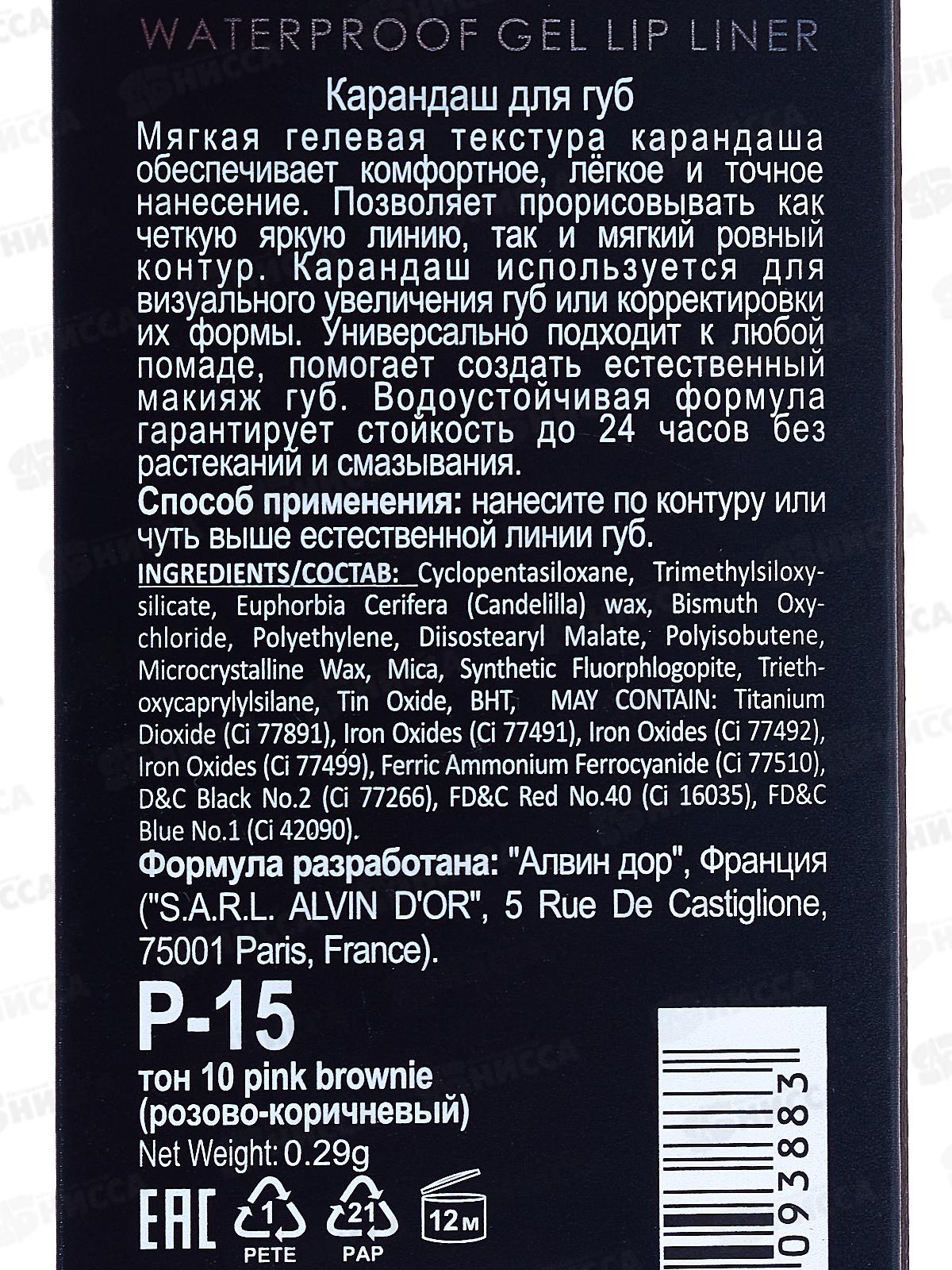 Алвин Дор Р-15 карандаш для губ гелевый водостойкий №10 розово-коричн