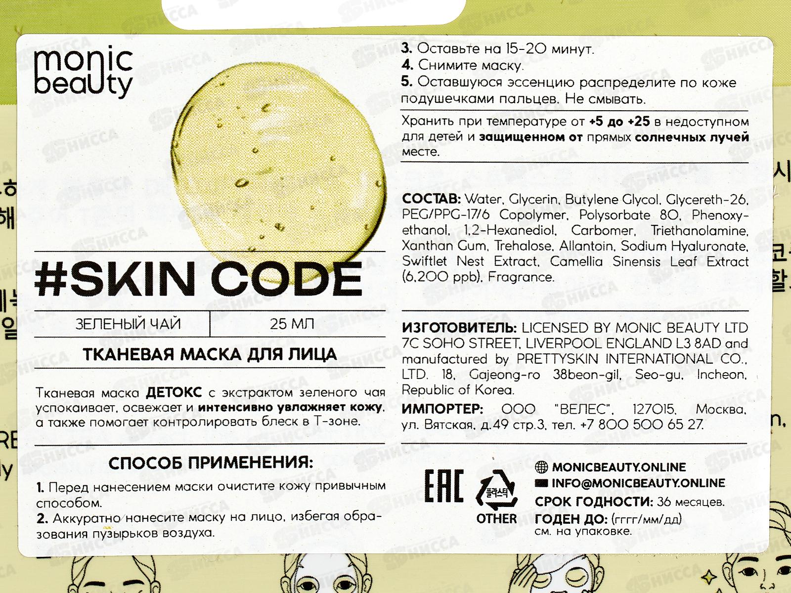 Monic Beauty Тканевая маска для лица Зеленый чай 25мл *10