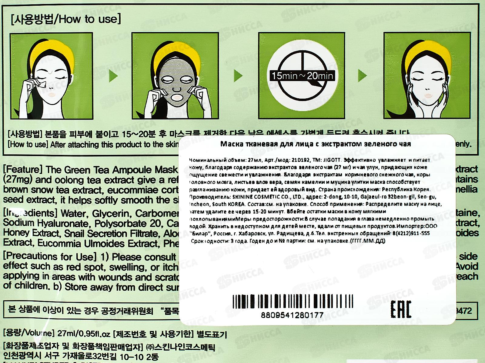 JIGOTT Маска для лица тканевая 27мл Увлажняющая Зеленый чай *600