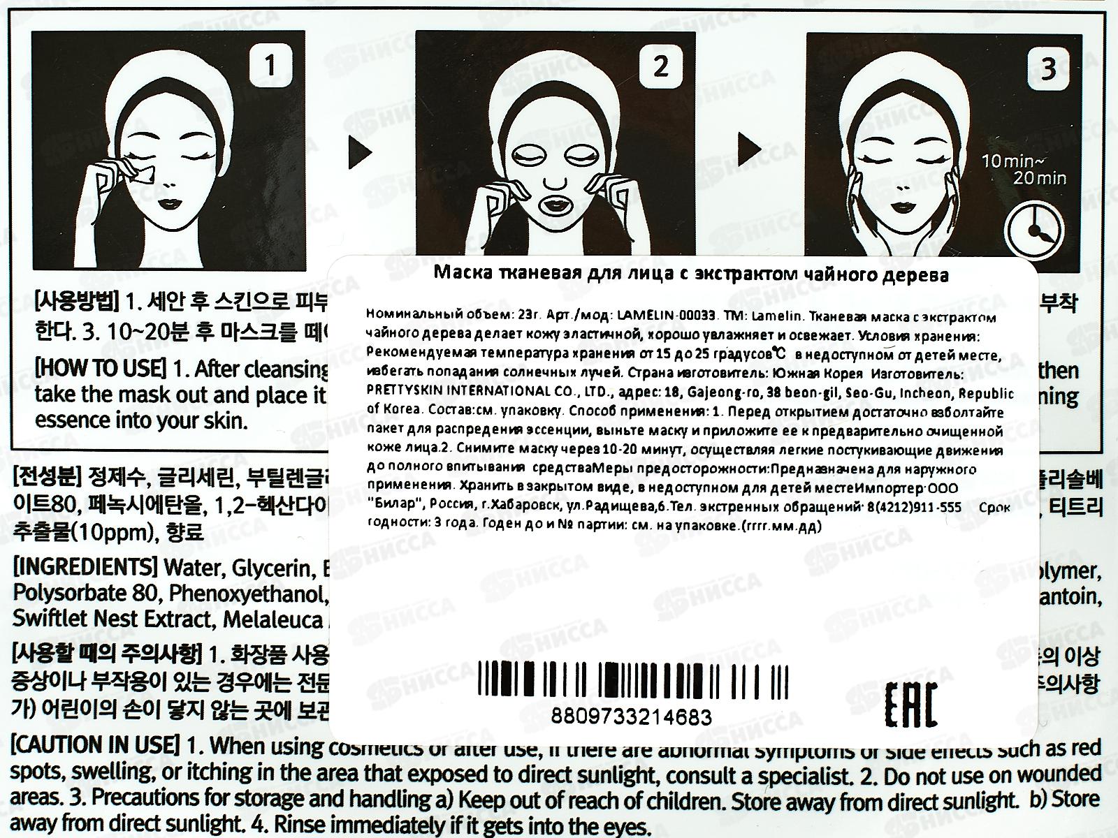 Lamelin маска для лица тканевая 23гр увлажняющая Чайное дерево *500