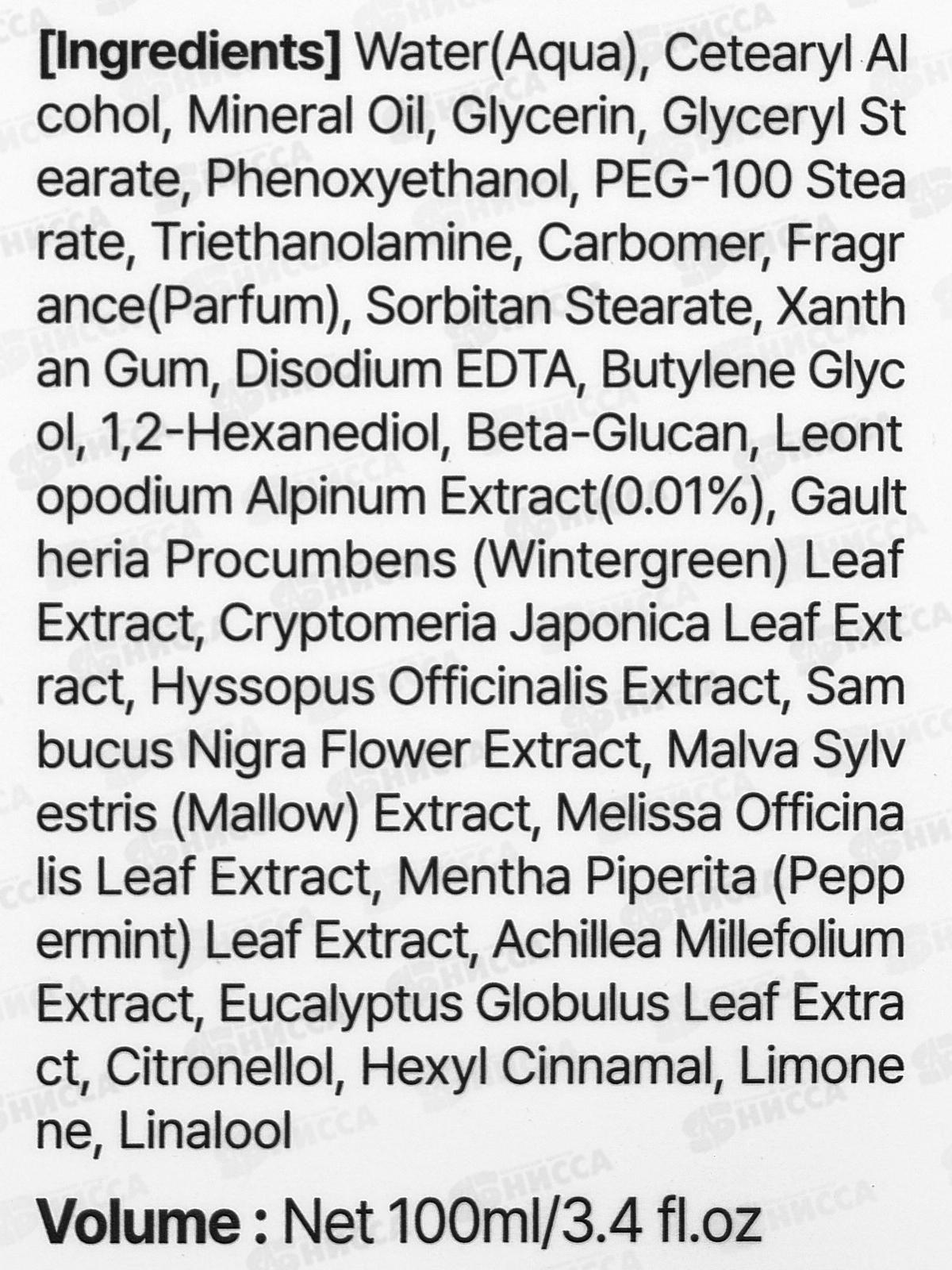 Состав: вода, цетеариловый спирт, минеральное масло, глицерилстеарат, глицерин, стеарат ПЭГ-100, феноксиэтанол, триэтаноламин, карбомер, сорбитанстеарат, ароматизатор, ксантановая камедь, хлорфенезин, экстракт леонтоподиума альпийского, масло косточек аргании колючей, бутиленгликоль, экстракт листьев гаультерии лежачей (wintergreen), экстракт иссопа лекарственного, экстракт листьев мяты перечной (mentha piperita), экстракт листьев эвкалипта шаровидного, экстракт цветков бузины черной, экстракт тысячелистника обыкновенного, экстракт листьев криптомерии японской, экстракт листьев мелиссы лекарственной, экстракт мальвы лесной (malva sylvestris), бета-глюкан, 1,2-гександиол, ЦИТРОНЕЛЛОЛ, бутилфенилметилпропиональ, линалоол, гексил Корица.