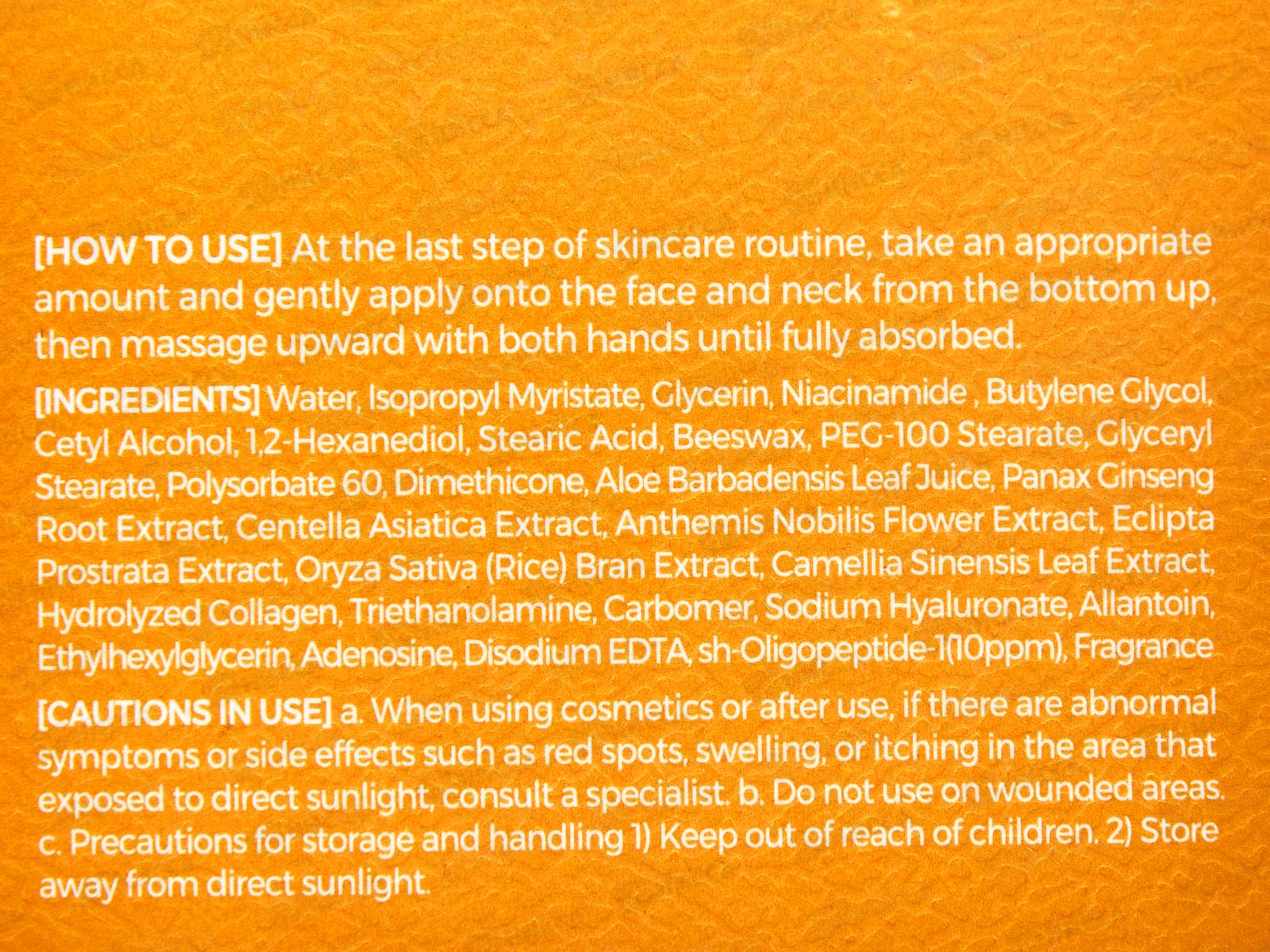 Состав: вода, метилпропандиол, глицерин, каприловый/каприновый триглицерид, дипропиленгликоль, цетилэтилгексаноат, ниацинамид, изопропилмиристат, масло ши, гиалуронат натрия, цетиловый спирт, хлорфенезин, бутиленгликоль, феноксиэтанол, динатриевая соль ЭДТА, дикалийглицирризат, карбомер, аргинин, 1,2-гександиол, экстракт зеленого чая, глицерилстеарат, стеариновая кислота, диметикон, SH-олигопептид-1 (10 частей на миллион), гидролизованный коллаген, бетаин, трегалоза, колисилбат 60, сесквиолеат сорбитана, аденозин, аллантоин, вода из прованской розы, экстракт центеллы азиатской, экстракт цветков ромашки, экстракт гамамелиса виргинского, экстракт листьев алоэ вера, отдушка.