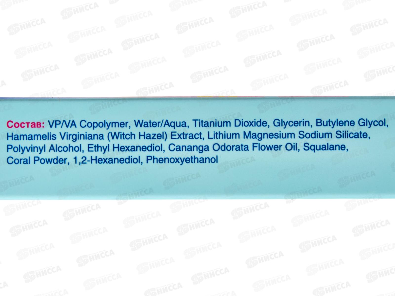 Состав: сополимер VP/NA, вода, диоксид титана, глицерин, бутиленгликоль, экстракт гамамелиса виргинского (гамамелиса), силикат лития, магния и натрия, поливиниловый спирт, этилгександиол, масло цветков кананги душистой, сквалан, коралловая пудра, 1,2-гександиол, феноксиэтанол.