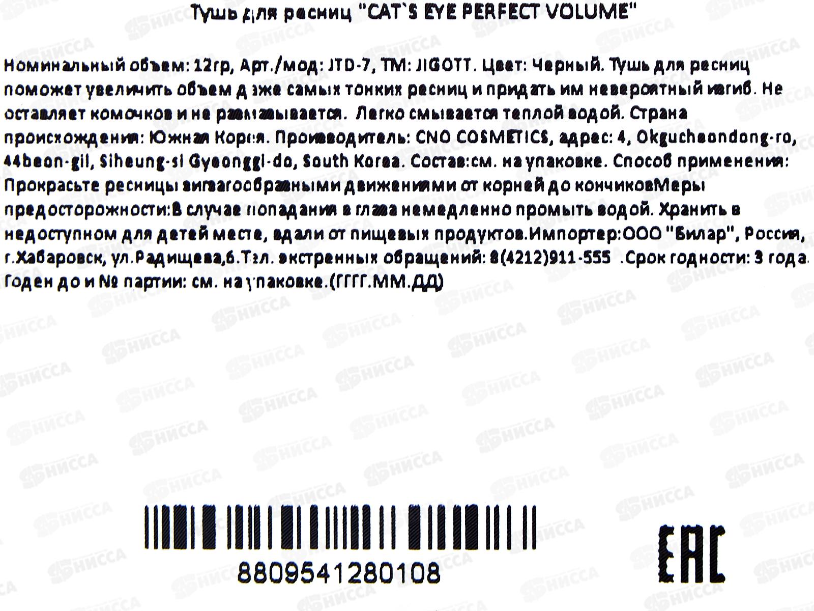 JIGOTT Тушь д/ресниц Cats Eye Perfect Volume черный 12мл