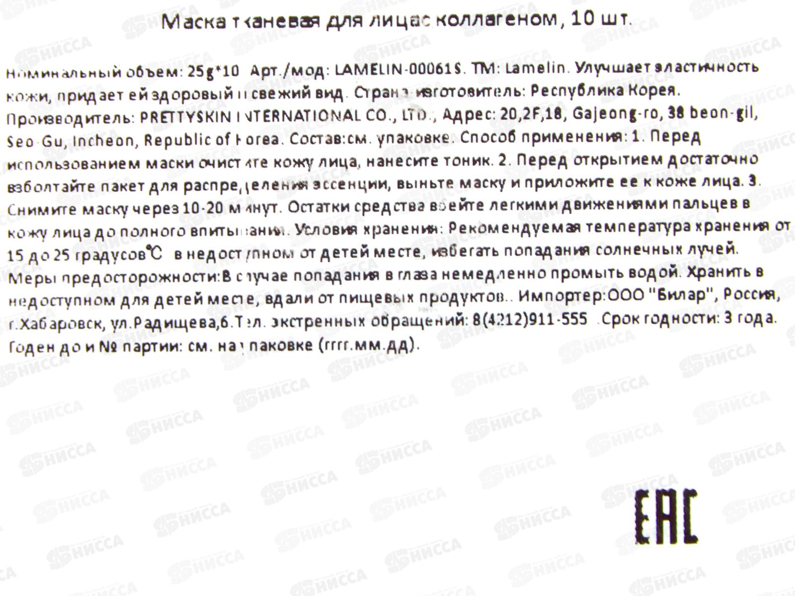 Lamelin маска для лица тканевая 23гр Эласт коллаген 10шт уп *40 218