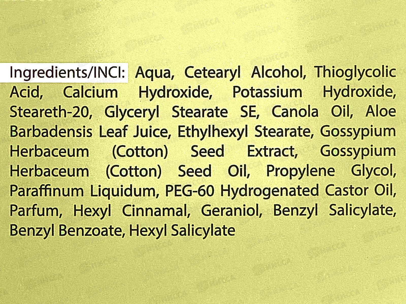 Состав: вода, цетеариловый спирт, тиогликолевая кислота, гидроксид кальция, гидроксид калия, стеарет-20; глицерилстеарат SE, масло канолы, масло Persea Gratissima, масло Olus, этилгексилстеарат; экстракт семян Gossypium Herbaceum (хлопка), масло семян Gossypium Herbaceum (хлопка); пропиленгликоль, жидкий парафин, ПЭГ-60 гидрогенизированное касторовое масло, парфюмерная композиция, гексилциннамаль; гераниол, бензилсалицилат, бензилбензоат, гексилсалицилат.