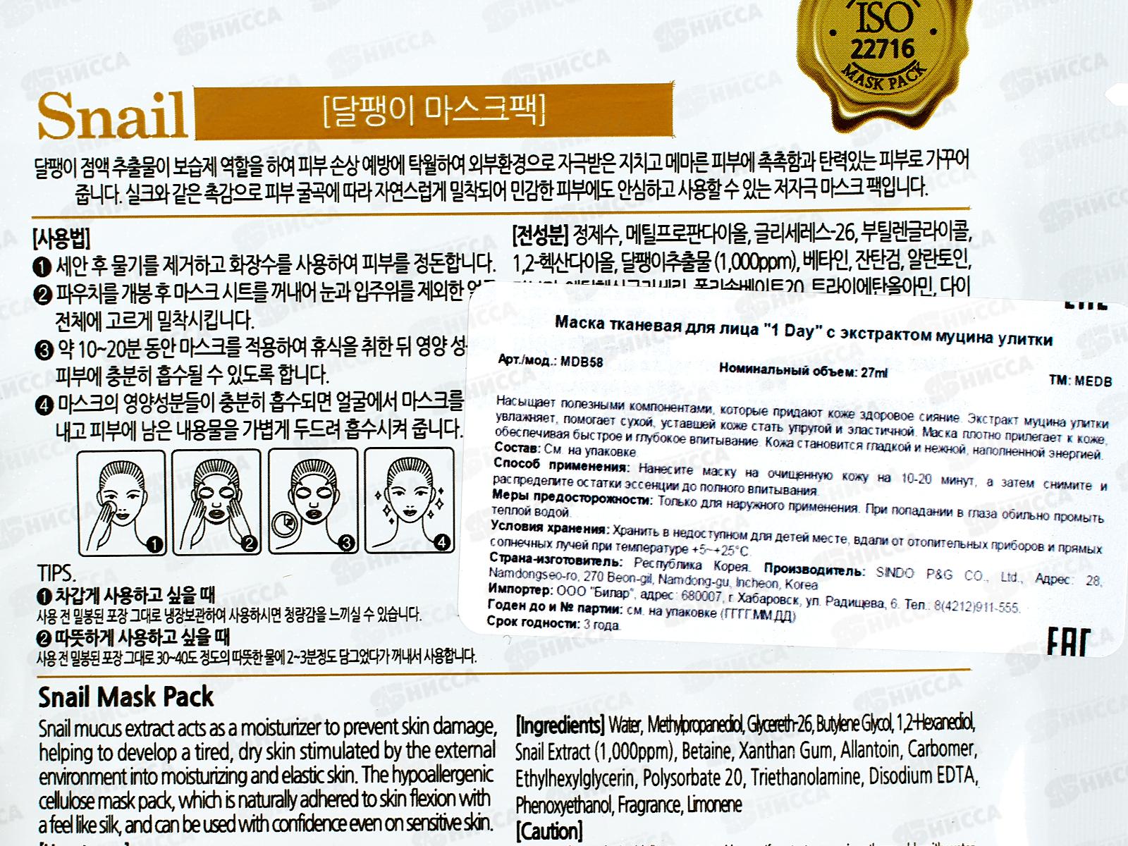 MEDB 1 Day маска для лица ткан 27мл С экстр муцин улит увлаж *600