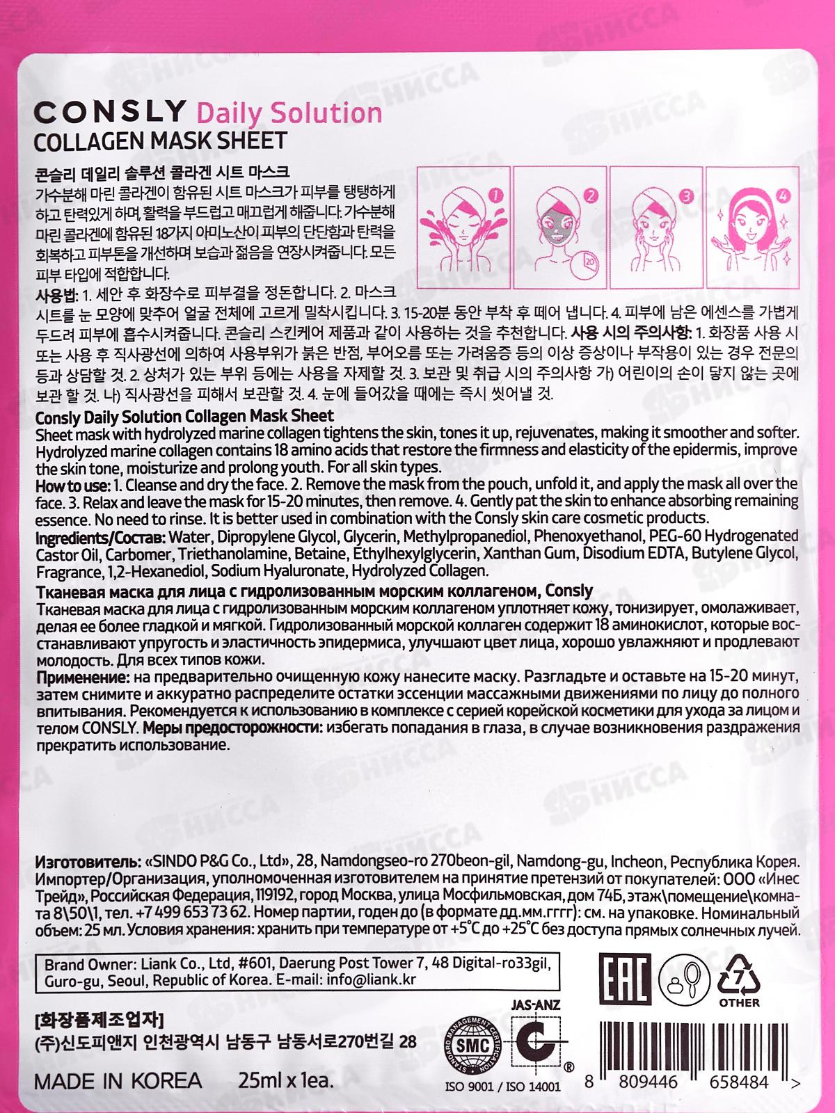 Consly Маска тканевая для лица с гидролизованным морским коллаген 25мл