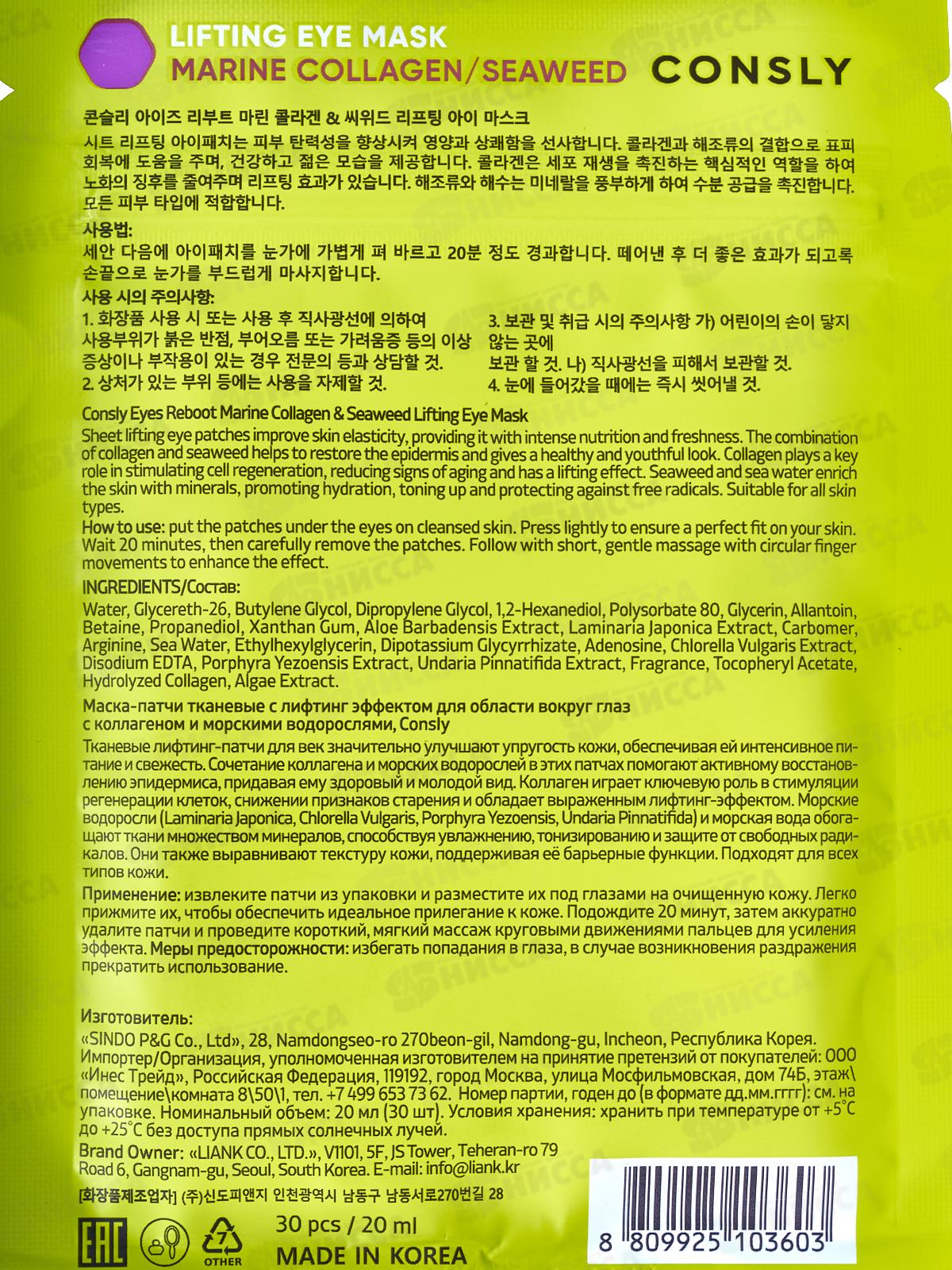 Consly Патчи маска ткан с лиф эффект с коллаг и морскими водор 30шт
